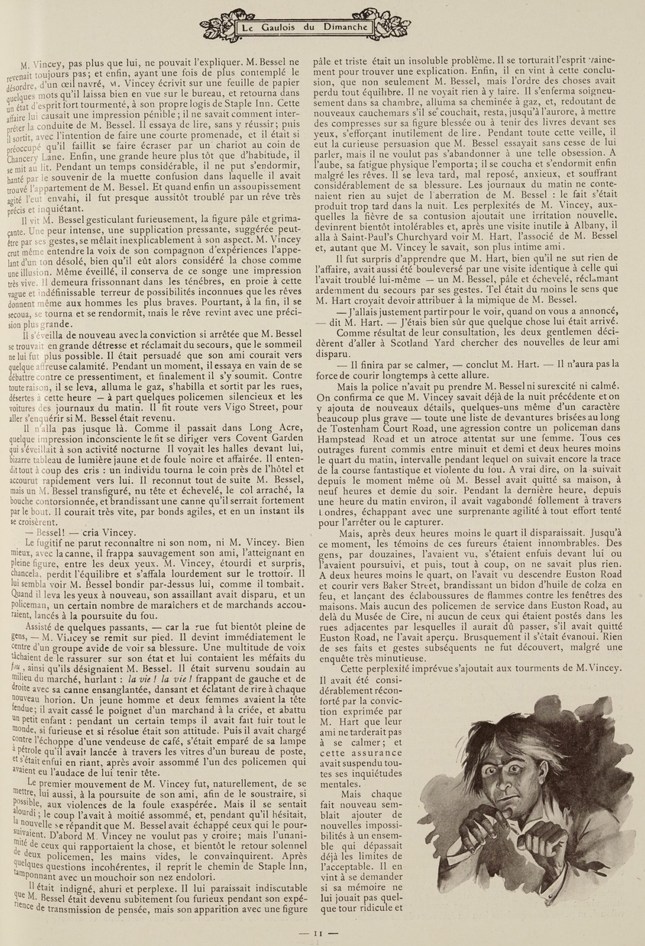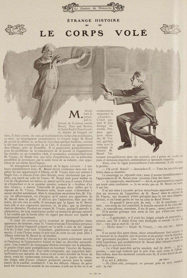 (Herbert George Wells, traduit par H.-D. Davray et B. Kozakiewicz, « Étrange Histoire, » in Le Gaulois du dimanche, quatrième année, n° 145, 22-23 juillet 1911 ; cette traduction est initialement parue dans le recueil Douze Histoires et un rêve, Paris : Mercure de France, 1909. La nouvelle originale, « The Stolen Body, » a été publiée dans The Strand Magazine en novembre 1898, avant d’être reprise dans le recueil Twelve Stories and a Dream, London: Macmillan and Co., 1903)