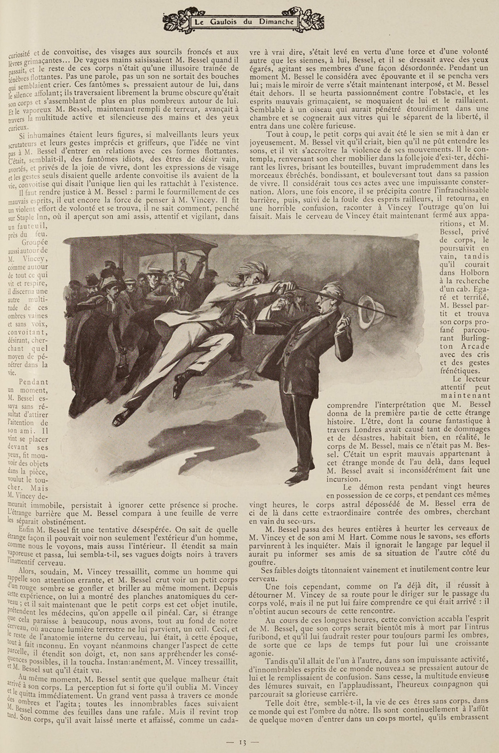(Herbert George Wells, traduit par H.-D. Davray et B. Kozakiewicz, « Étrange Histoire, » in Le Gaulois du dimanche, quatrième année, n° 145, 22-23 juillet 1911 ; cette traduction est initialement parue dans le recueil Douze Histoires et un rêve, Paris : Mercure de France, 1909. La nouvelle originale, « The Stolen Body, » a été publiée dans The Strand Magazine en novembre 1898, avant d’être reprise dans le recueil Twelve Stories and a Dream, London: Macmillan and Co., 1903)