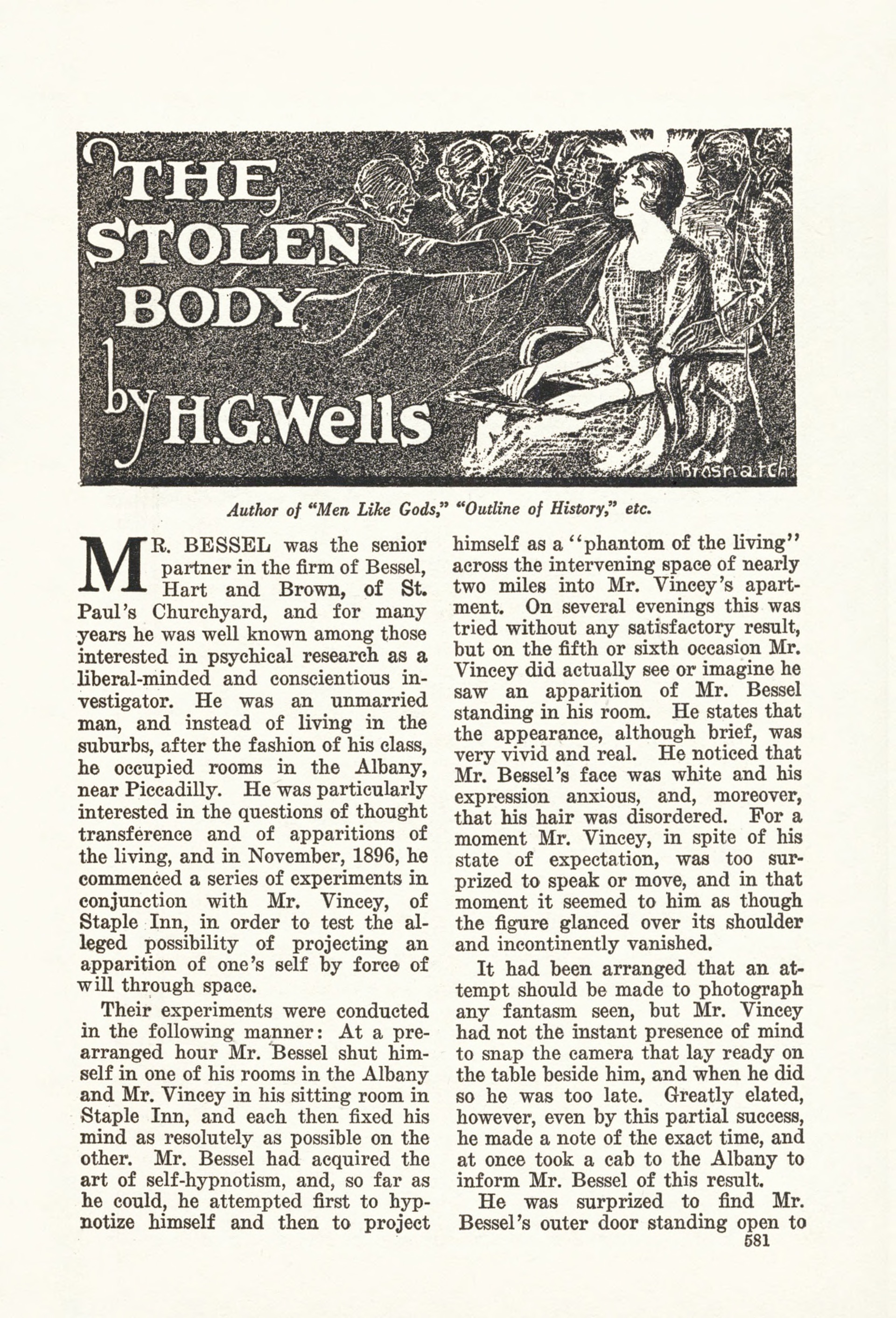 Bessel était le principal intéressé de la raison sociale Bessel, Hart and Brown, de Saint Paul’s Churchyard ; et, depuis de longues années, il était connu, de ceux qu’intéressent les recherches psychiques, comme un investigateur consciencieux et d’esprit large. M. Bessel observait le célibat, et, au lieu de vivre dans quelque banlieue, comme le fait tout bon commerçant de la Cité, il occupait un appartement dans Albany, près de Piccadilly. Il se passionnait particulièrement pour les problèmes de la transmission de la pensée et d’apparitions des vivants ; et, en novembre 1896, il commença, conjointement avec M. Vincey, de Staple Inn, une série d’expériences sur la prétendue possibilité de provoquer, par la seule force de sa volonté, une apparition de soi-même dans l’espace.