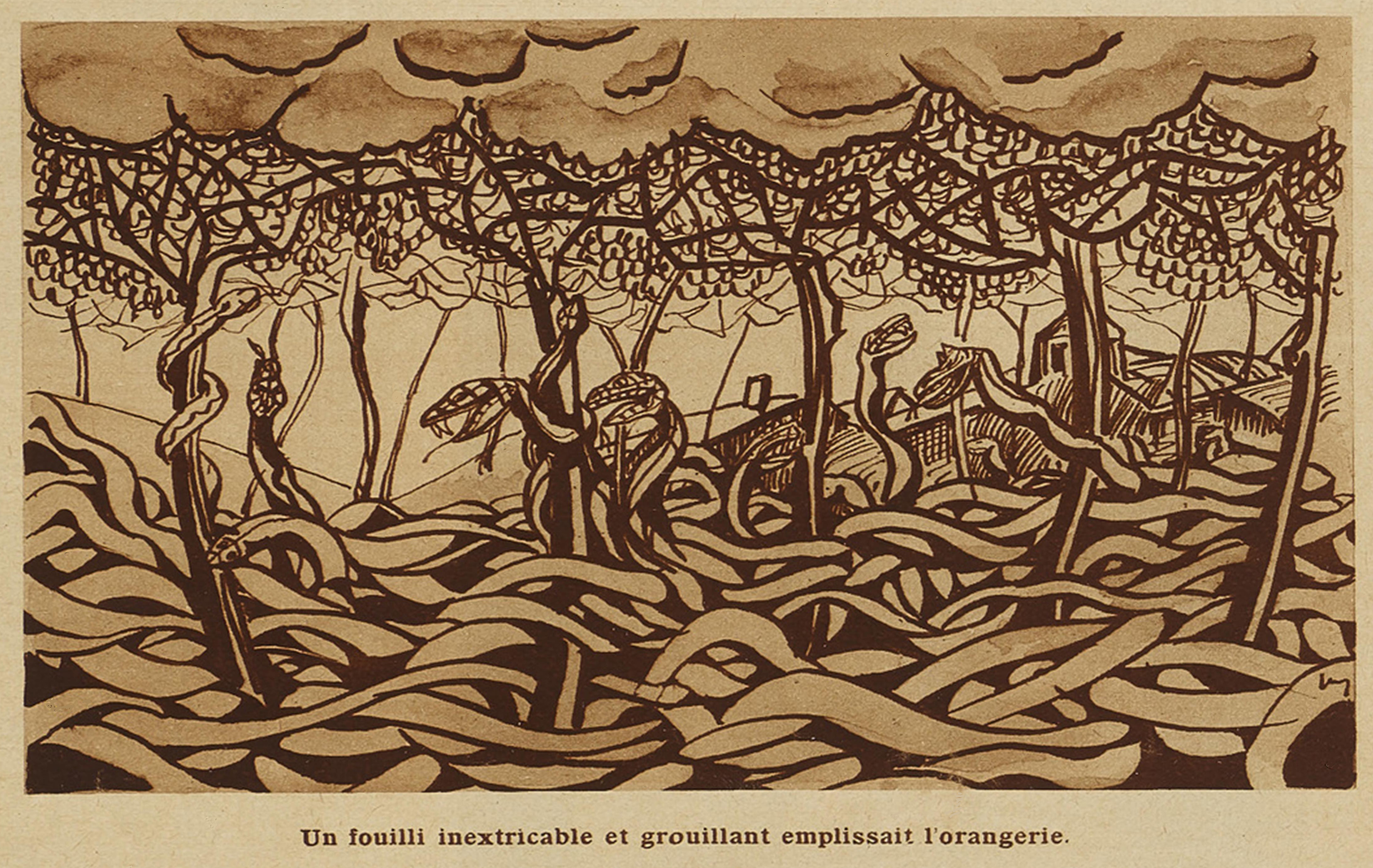 Des serpents de toutes dimensions se balançaient sur les fils électriques, montaient le long des croisées, se faufilaient par les ouvertures du toit. Un serpent noir et tacheté, long de plusieurs mètres, s’enroulait autour du globe, d’où sa tête pendait comme un balancier. Des serpents à sonnette crépitaient en sifflant et une odeur de pourriture et de marécage se dégageait de l’orangerie.