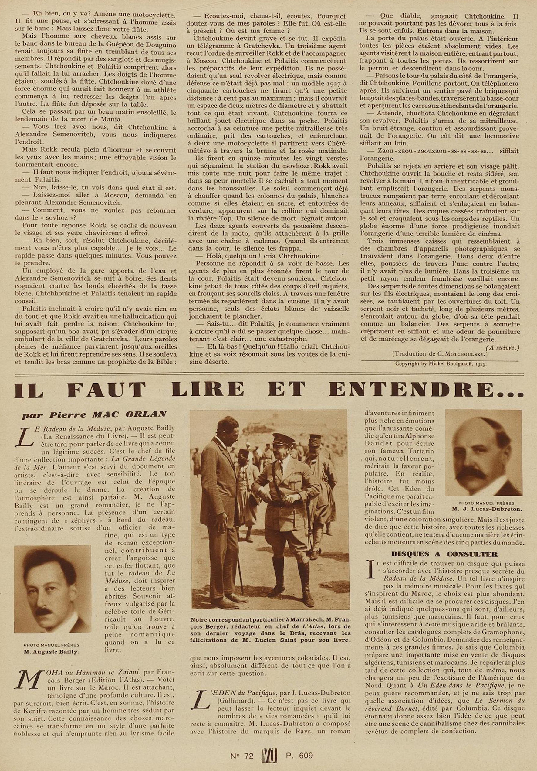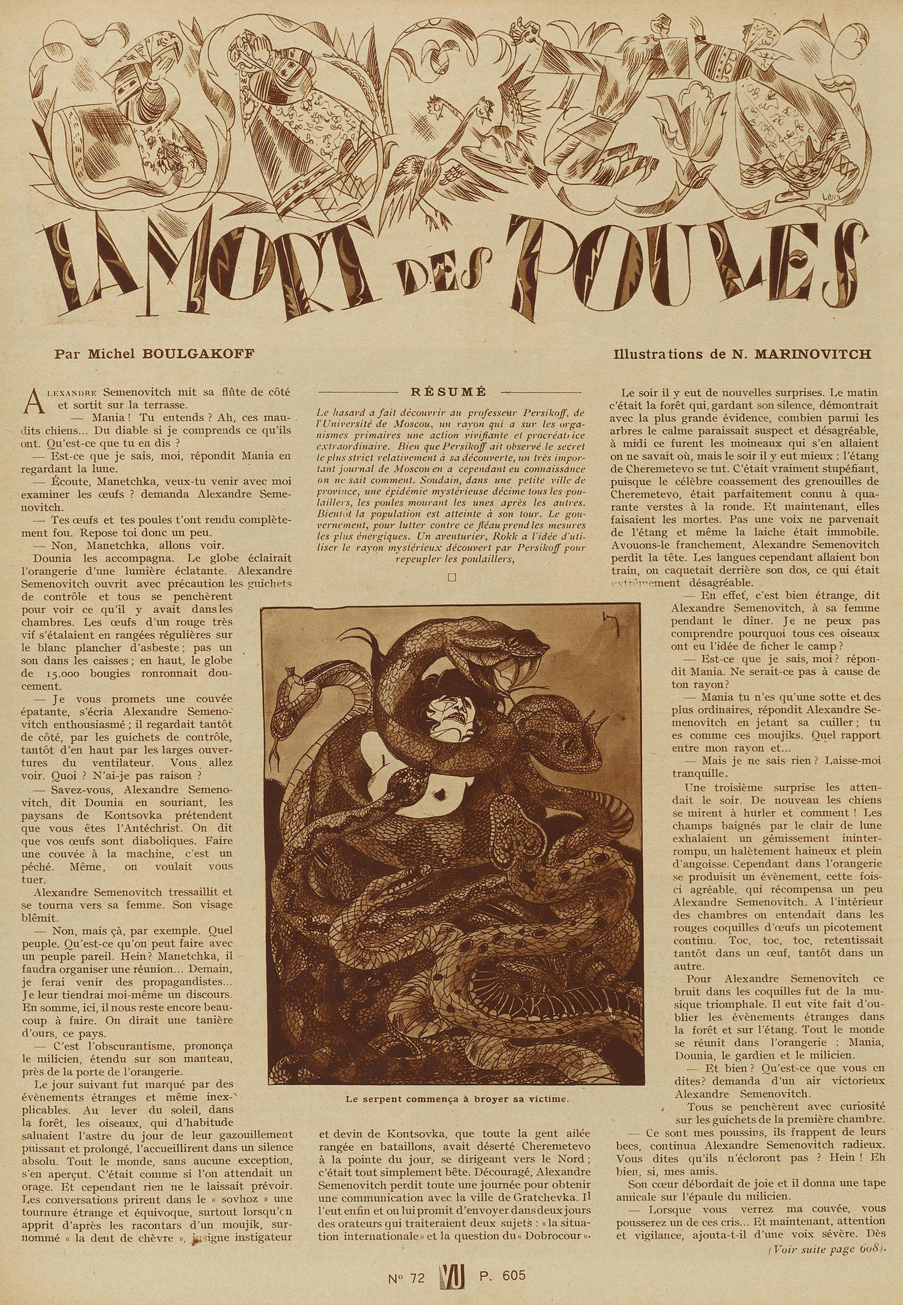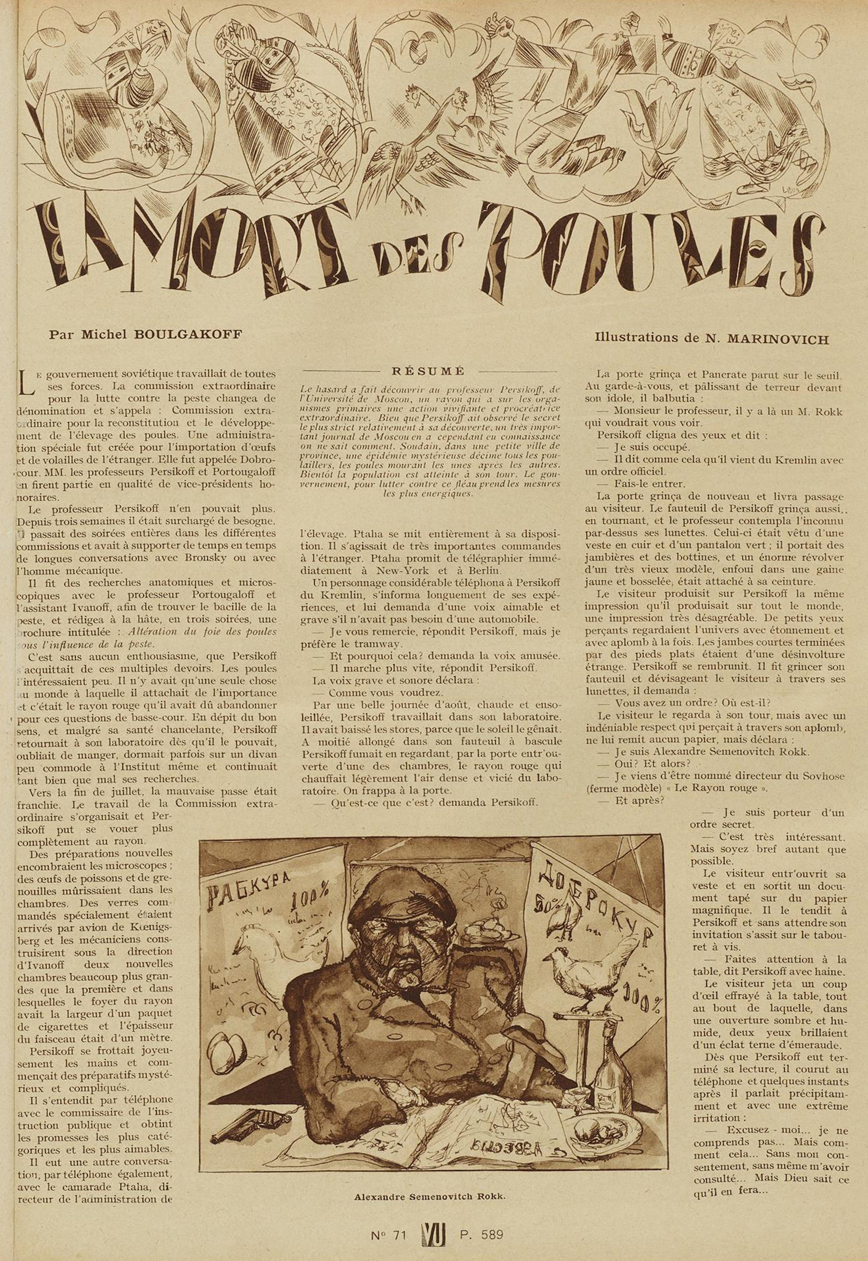 (Michel Boulgakoff [« Роковые яйца, » in Недра (almanach Niedra), février 1925], illustrations de Nicolas Marinovich, in Vu, journal de la semaine, n° 72, mercredi 31 juillet 1929. Cette nouvelle a été traduite par François Cornillot et Alain Préchac dans le recueil Les Oeufs fatidiques, Verviers : Marabout-Gérard, collection « Bibliothèque Marabout Science Fiction » n° 452, 1973)