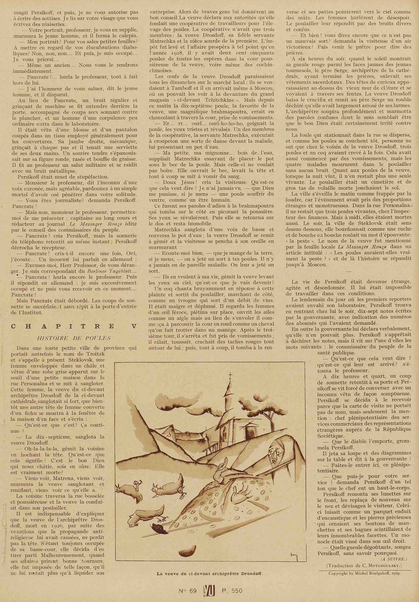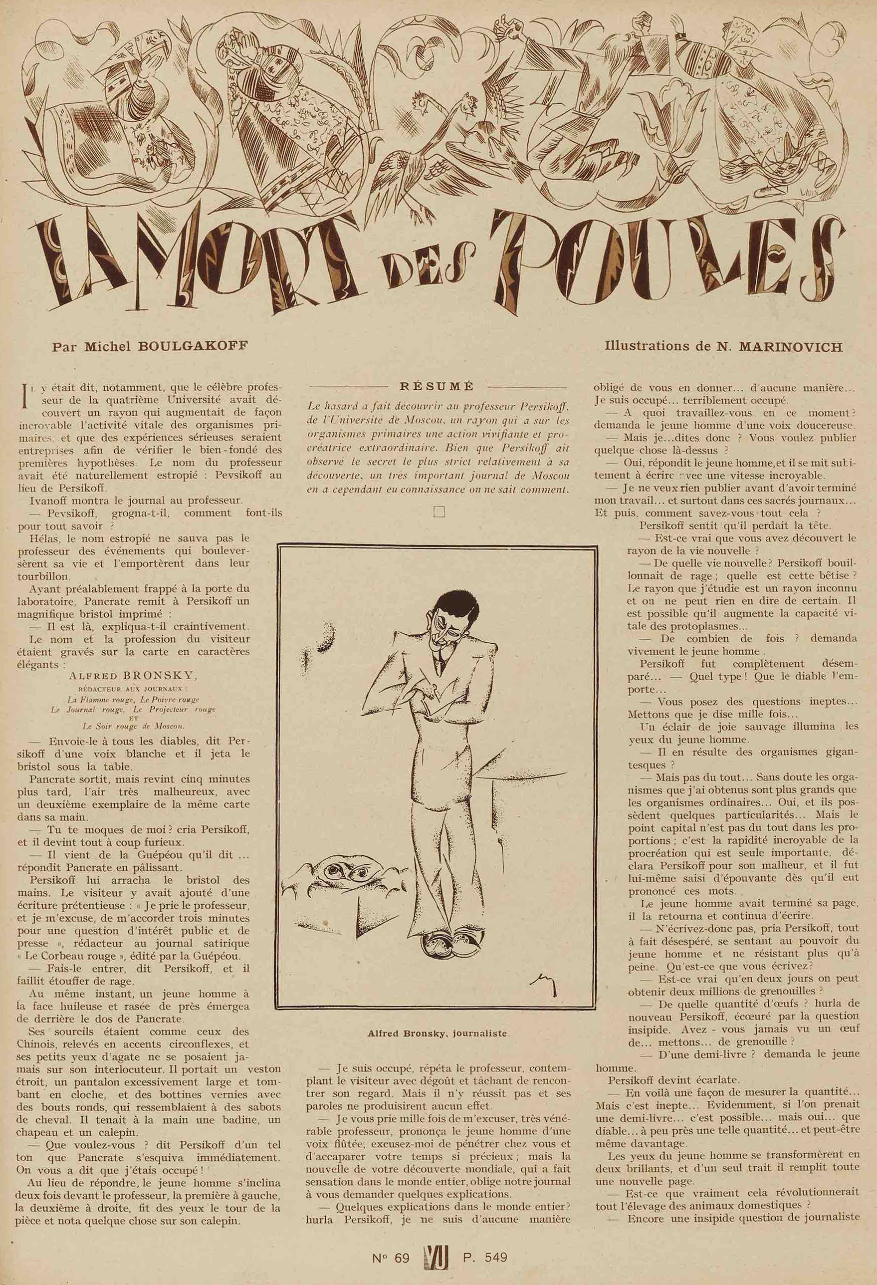 (Michel Boulgakoff [« Роковые яйца, » in Недра (almanach Niedra), février 1925], illustrations de Nicolas Marinovich, in Vu, journal de la semaine, n° 69, mercredi 10 juillet 1929. Cette nouvelle a été traduite par François Cornillot et Alain Préchac dans le recueil Les Oeufs fatidiques, Verviers : Marabout-Gérard, collection « Bibliothèque Marabout Science Fiction » n° 452, 1973)