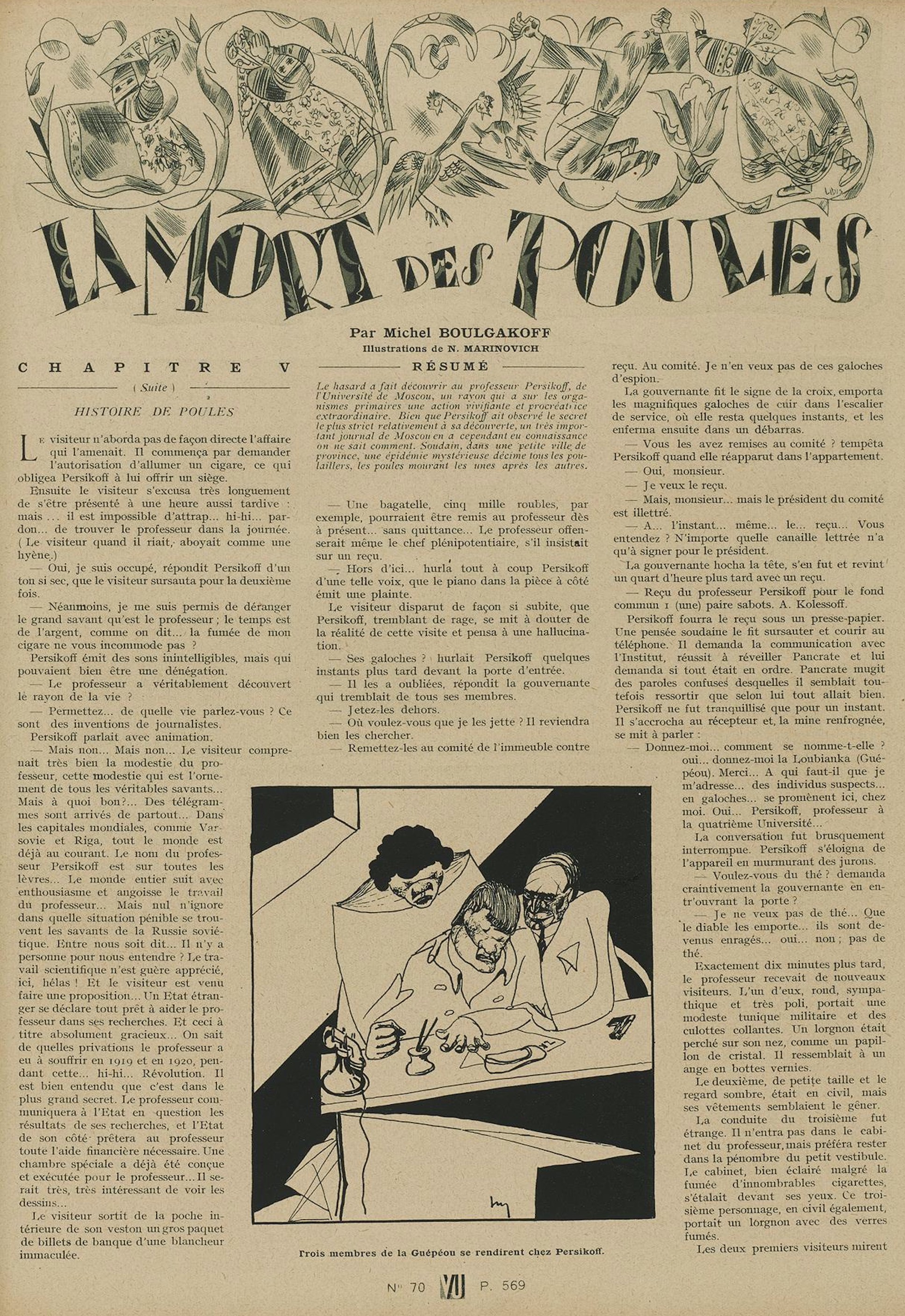 (Michel Boulgakoff [« Роковые яйца, » in Недра (almanach Niedra), février 1925], illustrations de Nicolas Marinovich, in Vu, journal de la semaine, n° 70, mercredi 17 juillet 1929. Cette nouvelle a été traduite par François Cornillot et Alain Préchac dans le recueil Les Oeufs fatidiques, Verviers : Marabout-Gérard, collection « Bibliothèque Marabout Science Fiction » n° 452, 1973)