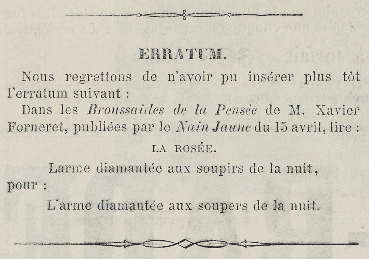 (Xavier Forneret, in Le Nain jaune national, politique, littéraire et financier, nouvelle série, sixième année, n° 478, mardi 7 avril 1868)
