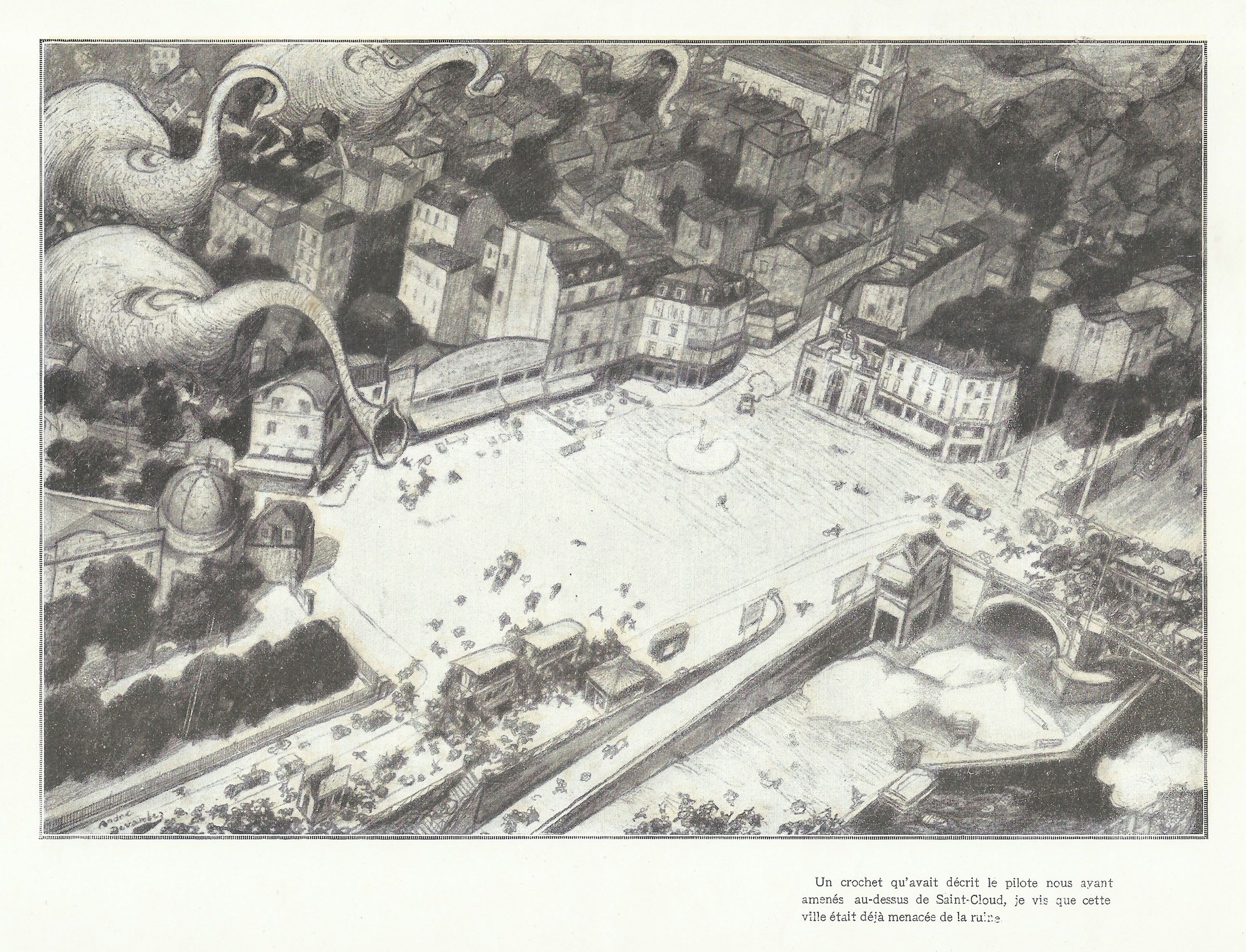 Lâchés dans la nuit, les macrobes se répandent, aspirant avec un bruit de sirène tous les êtres humains, qui viennent s’engloutir dans leur trompe évasée. Au mont Valérien, une batterie tire sur les bêtes, en train de franchir la Seine à la hauteur de Colombes ; mais les obus éclatent sans entamer l’armure écailleuse des monstres.