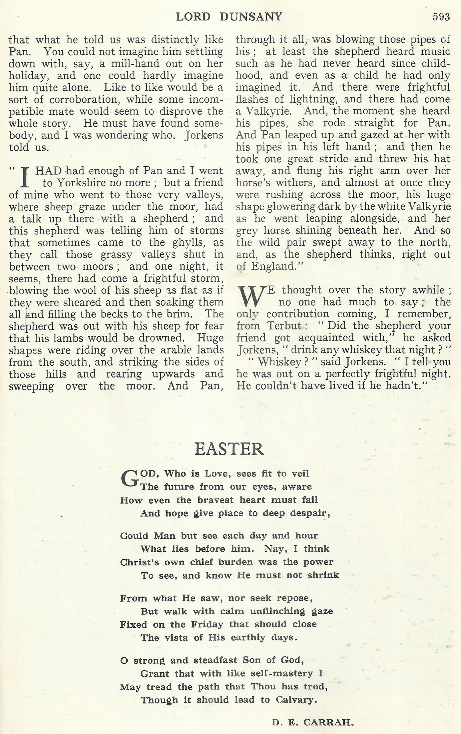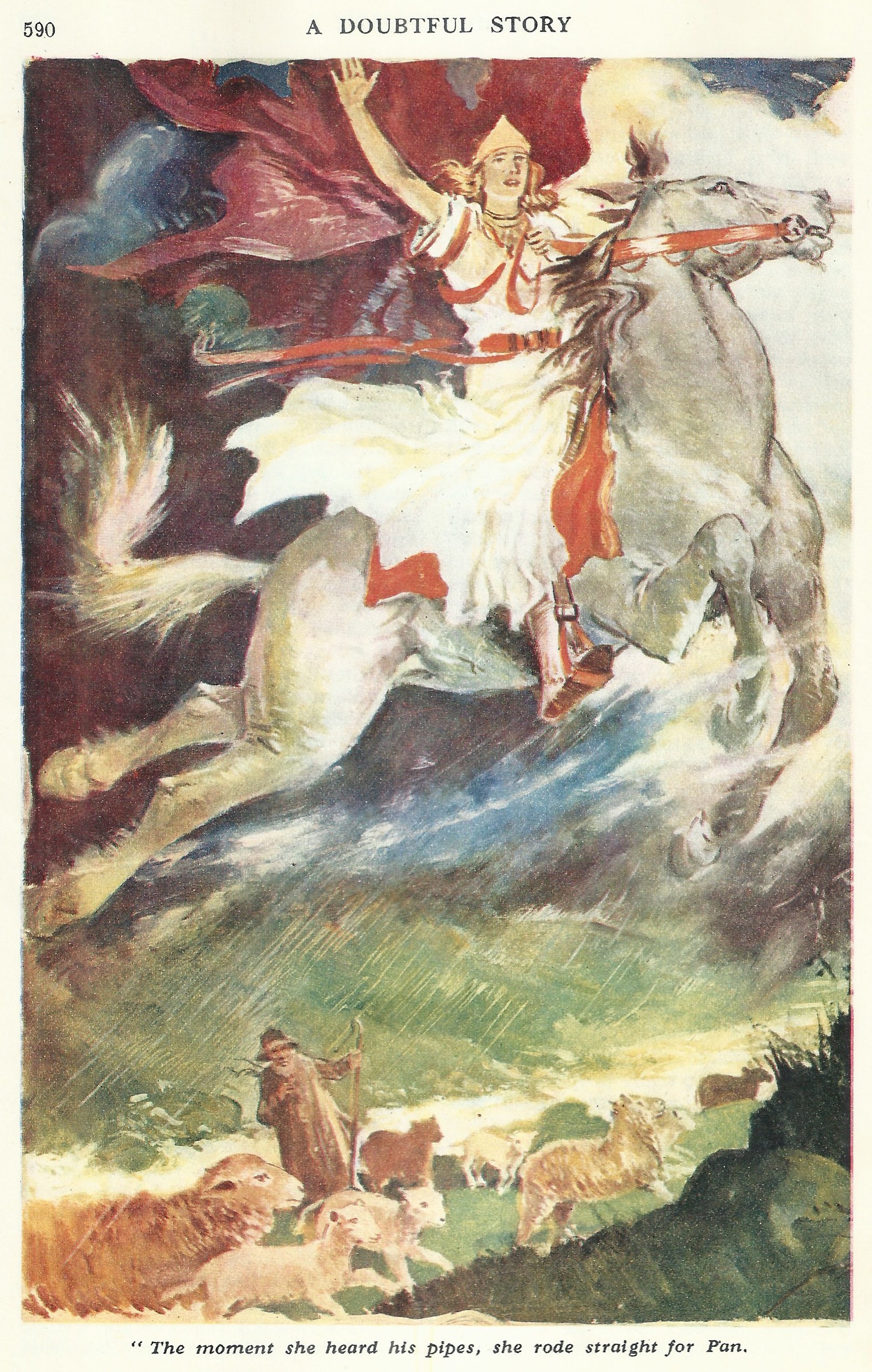 « J’étais excédé de Pan et je ne retournai pas en Yorkshire ; mais un de mes amis alla dans ces vallées où les moutons paissent au bas des landes et vint à causer avec un berger ; celui-ci lui parla des orages qui s’abattent parfois sur les ghylls, nom qu’on donne à ces vallées herbeuses encaissées entre deux landes. Il dit qu’une nuit, un terrible orage s’était formé. La laine des moutons était tellement aplatie par le vent qu’on les eût crus tondus ; ils dégouttaient d’eau ; les ruisseaux coulaient à pleins bords. Le berger était resté dehors, de crainte de voir ses agneaux noyés. Des ombres gigantesques passaient sur les terres labourées, venant du sud, se heurtaient au flanc des collines, et remontaient en flèche pour se déchirer sur la crête des landes. Et, au milieu de tout cela, Pan soufflait dans ses pipeaux ; du moins, le berger entendit une musique comme il n’en avait jamais entendu depuis son enfance, et, même alors, il l’avait seulement rêvée. Il y avait des éclairs effrayants, d’où sortit soudain une Walkyrie. Dès qu’elle entendit les pipeaux de Pan, elle se dirigea droit sur lui. Pan se redressa, son regard levé sur elle, avec ses pipeaux dans la main gauche. Alors, il fit un grand pas, jeta son chapeau au loin, empoigna de la main droite la crinière du cheval, et, instantanément, ils dévalèrent à travers la lande ; sa grande silhouette sombre se détachait près de la blanche Walkyrie, tandis qu’il gambadait à côté de l’étincelant cheval gris qui la portait. Le couple sauvage s’évanouit vers le nord, et même hors d’Angleterre, de l’avis du berger. »