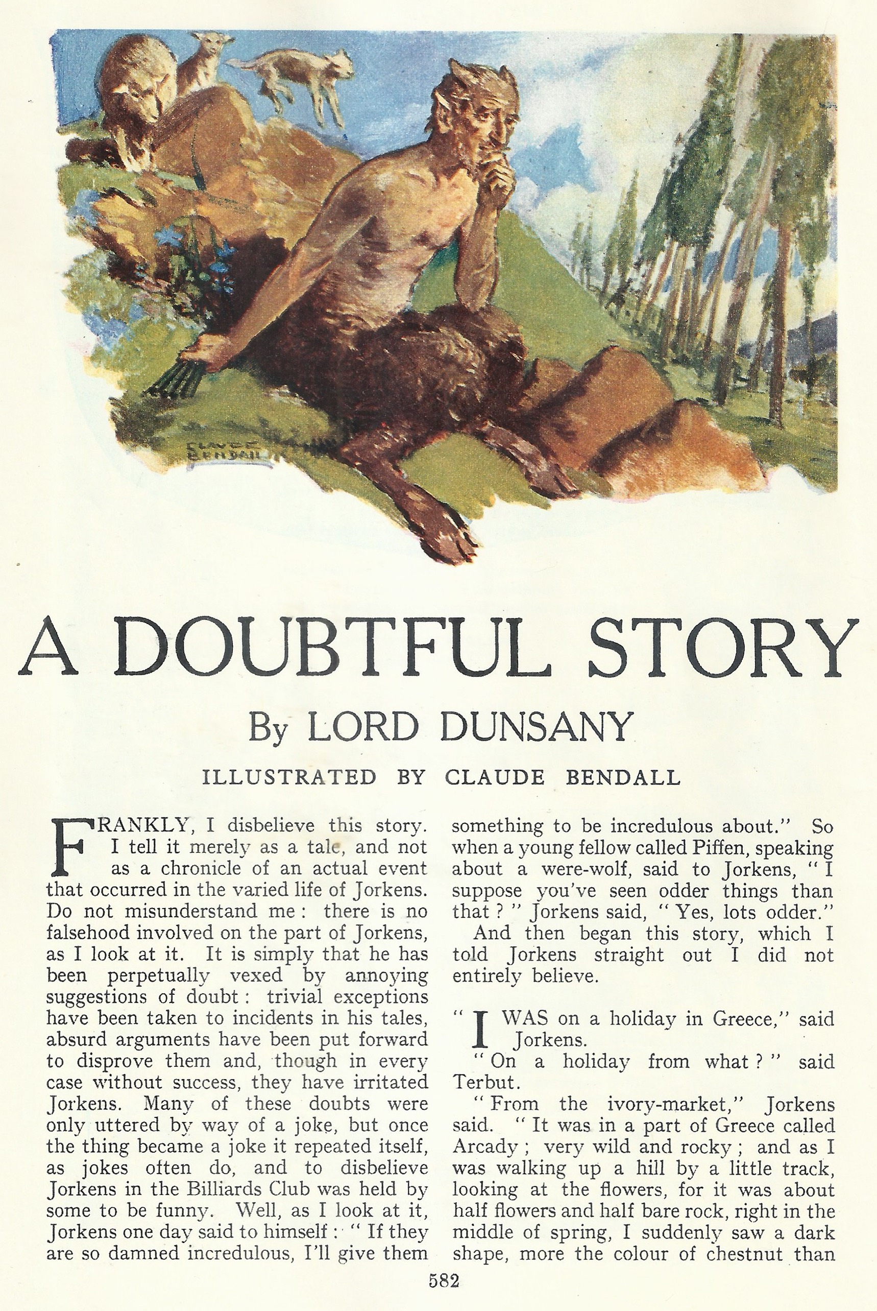 (Lord Dunsany, « A Doubtful Story, » illustré par Claude Bendall, in The Windsor Magazine, n° 532, London: Ward Lock, avril 1939 ; cette nouvelle sera reprise en volume dans le recueil Jorkens Has A Large Whiskey, London: Putnam, septembre 1940)