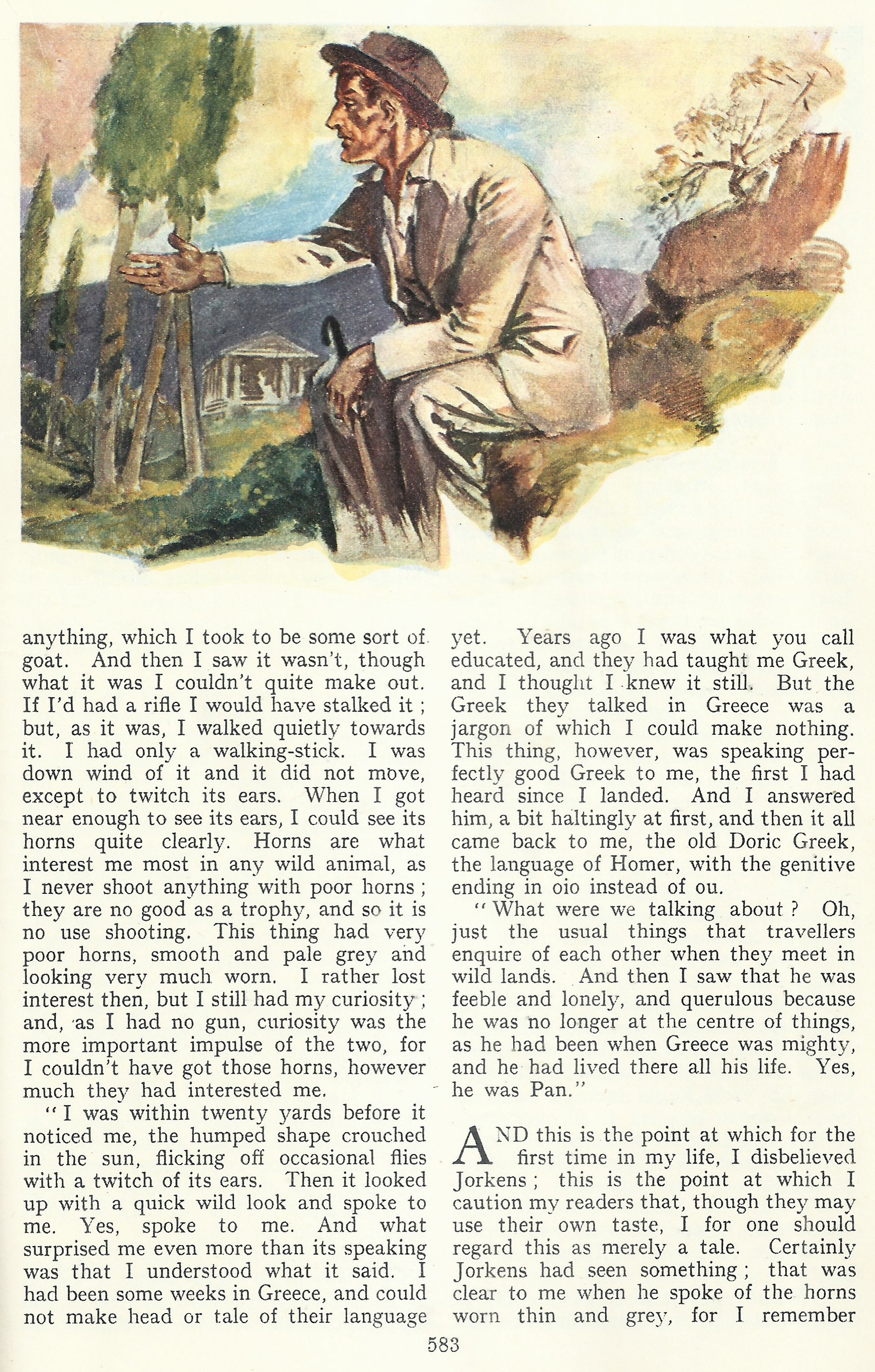 « C’était Pan, poursuivit Jorkens, Pan, vétuste et grognon, désirant par-dessus tout être de nouveau au centre du monde dont la Grèce avait été autrefois le pivot.