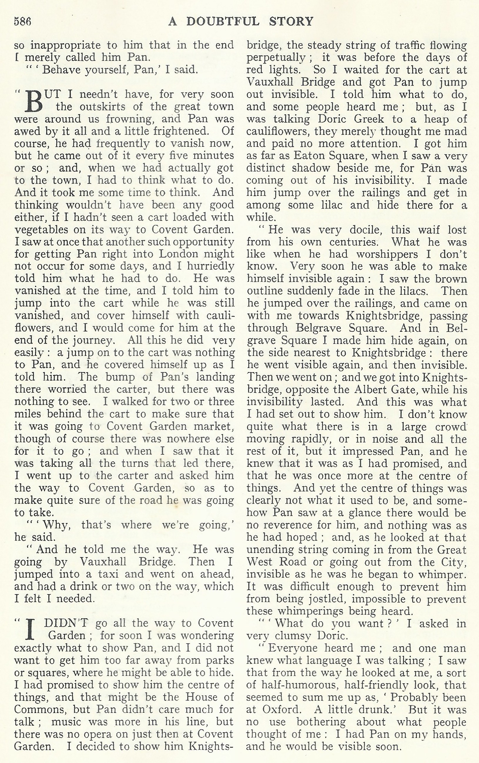 Recommandation inutile, car bientôt la banlieue de la grande cité nous entourait, et Pan en était un peu intimidé et effrayé. Naturellement, il fallait qu’il se rendît fréquemment invisible, mais il réapparaissait toutes les cinq minutes environ ; aussi, quand nous entrâmes dans la ville, il me fallut trouver un plan, et je pris quelques instants de réflexion. Réfléchir ne m’aurait servi de rien si je n’avais aperçu une charrette de légumes en route pour Covent Garden. Je compris aussitôt que je ne trouverais pas de longtemps une aussi belle occasion de faire pénétrer Pan au cœur de Londres, et je me hâtai de lui dire ce qu’il fallait faire. À ce moment, il était invisible. Je lui dis d’en profiter pour sauter dans la charrette et se cacher sous les choux-fleurs, lui promettant de venir le chercher à la fin de la journée. Il fit tout cela très facilement ; un saut dans la charrette n’était rien pour lui, et il se cacha suivant mes instructions. Le choc produit par l’atterrissage de Pan intrigua le charretier, mais il ne pouvait rien voir. Je suivis la charrette pendant deux ou trois milles pour m’assurer qu’elle allait bien au marché de Covent Garden, quoique la chose ne fît aucun doute ; et, quand je vis qu’elle suivait tous les détours qui y conduisent, je m’approchai du charretier et lui demandai le chemin de Covent Garden, pour être bien sûr de la route qu’il allait prendre.