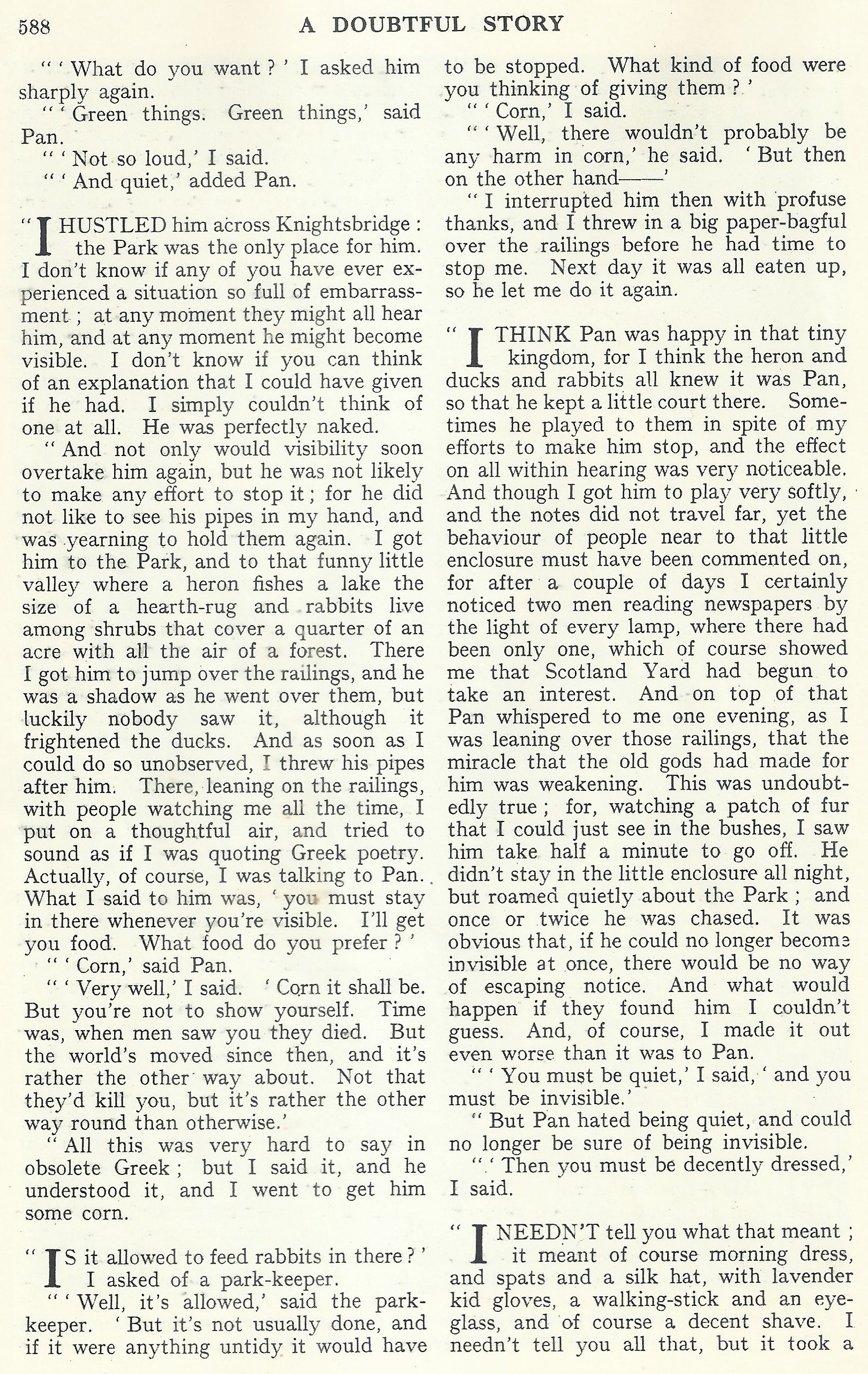 Une fois cela terminé, nous partîmes nous promener, et j’expliquai à Pan que le moment était venu de décider ce que nous allions faire et que la première décision à prendre était de ne plus s’en remettre à son don d’invisibilité. Je lui expliquai que ce prodige n’avait plus d’intérêt dès l’instant qu’il n’agissait plus parfaitement. Il m’approuva entièrement et consentit même aux chaussures, qui cependant lui rendaient la marche douloureuse et lui interdisaient tout galop ; mais je lui fis comprendre qu’il n’était pas nécessaire de galoper dans Londres. Pour quelqu’un qui en était aux usages d’il y a deux mille ans, il saisit étonnamment vite.