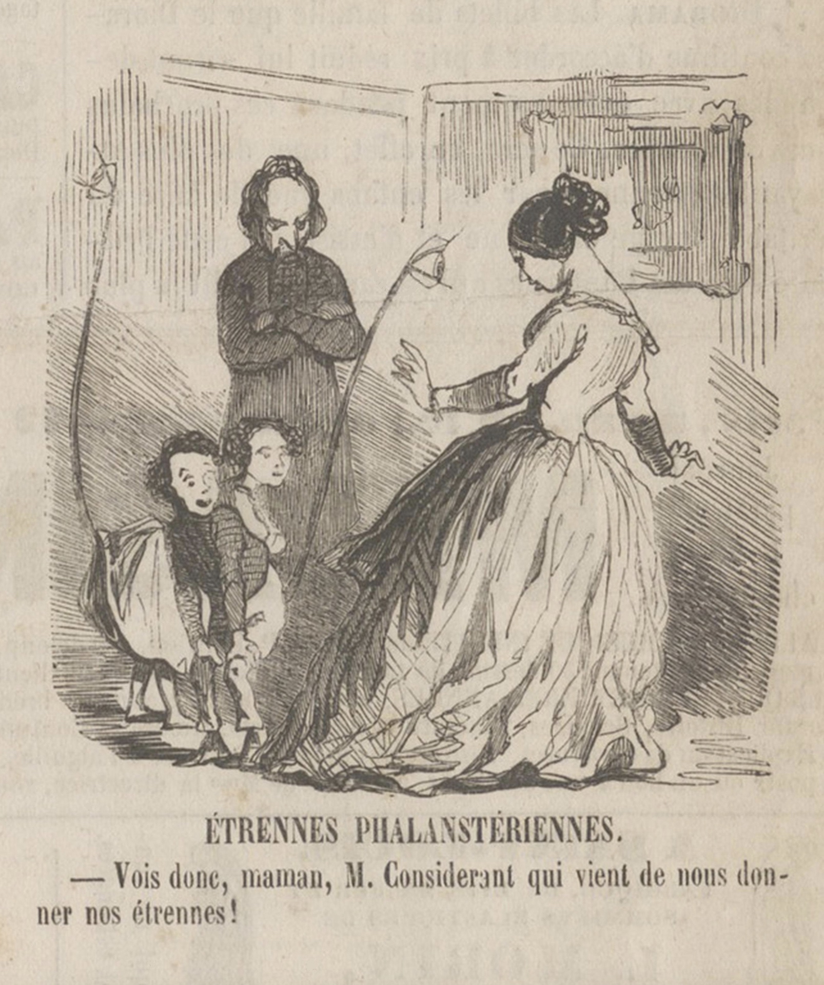 (in Le Messager de la Haute-Marne, dimanche 14 octobre 1849 ; « Nouvelles diverses, » in L’Ordre, journal quotidien, politique et littéraire, n° 181, lundi 22 octobre 1849 ; in Journal de Toulouse, politique et littéraire, quarante-cinquième année, n° 286, mercredi 24 octobre 1849 ; in Journal du Cher, politique, littéraire, industriel, quarante-deuxième année, n° 127, jeudi 25 octobre 1849 ; in Courrier du Tarn-et-Garonne et Conciliateur, dixième année, n° 1683, jeudi 25 octobre 1849 ; in La Semaine, encyclopédie de la presse périodique, quatrième année, n° 43, vendredi 26 octobre 1849 ; « Le Phénomène phalanstérien, » in La Constitution, journal des Pyrénées, première année, n° 71, samedi 27 octobre 1849 ; in Le Petit Courrier de Bar-sur-Seine, journal judiciaire, agricole, industriel et littéraire, vingt-neuvième année, n° 432, samedi 27 octobre 1849 ; « Départements, » in Journal du Tarn politique, littérature, industrie, agriculture, quinzième année, n° 44, samedi 27 octobre 1849 ; « Une Queue phalanstérienne, » in Journal des villes et des campagnes, des maires, des familles, et feuille parisienne, trente-quatrième année, n° 297, dimanche 28 octobre 1849 ; « Canards d’automne, » in Le Tintamarre, critique de la Réclame, satire des Puffistes, septième année, du 28 octobre au 3 novembre 1849 ; « La Queue et l’oeil du fouriérisme, » in L’Argus, première année, n° 76, dimanche 28 octobre 1849 ; « Nouvelles locales, » in Le Châtillonais, journal des intérêts de tous, vingt-et-unième année, n° 74, jeudi 1er novembre 1849 ; « Mélanges, » in Indicateur pour la ville de Strasbourg et le département du Bas-Rhin, feuille d’annonces et de variétés, n° 95, mercredi 28 novembre 1849. Ce canard est également cité dans le Traité pratique des maladies de l’œil de W. Mackenzie, traduit par le docteur E. Warlomont et A. Testelin, tome 2, section VI, p. 544 [Abnormités congéniales du globe oculaire, etc.], Paris : Victor Masson, 1857. Caricature de Victor Considérant par Job, couverture illustrée de L’Éclipse, deuxième année, n° 89, dimanche 3 octobre 1869)