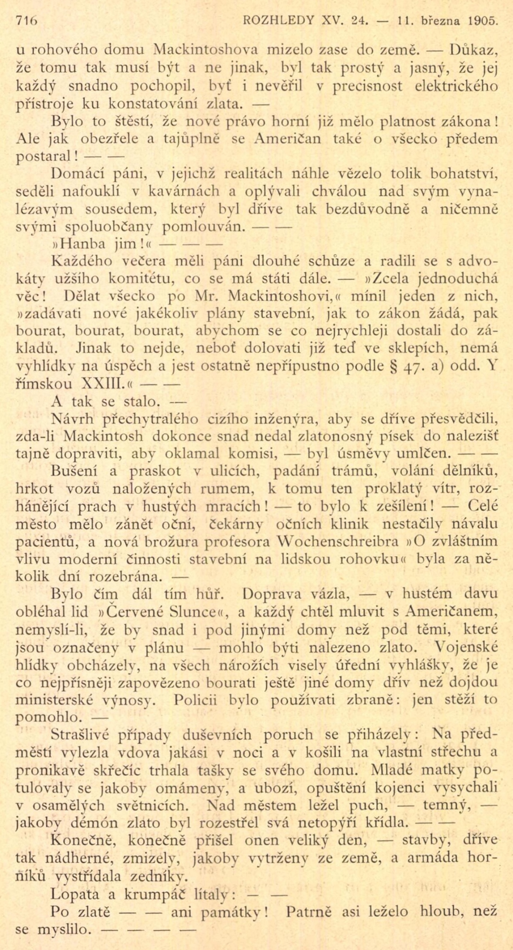 « Messieurs, Mackintosh prétend avoir trouvé, dans le sous-sol de cette maison qu’il a fait démolir rue aux Perles, du minerai d’or ! assura un fonctionnaire du service des mines. On a même convoqué par télégramme, à Vienne, une commission d’études. »