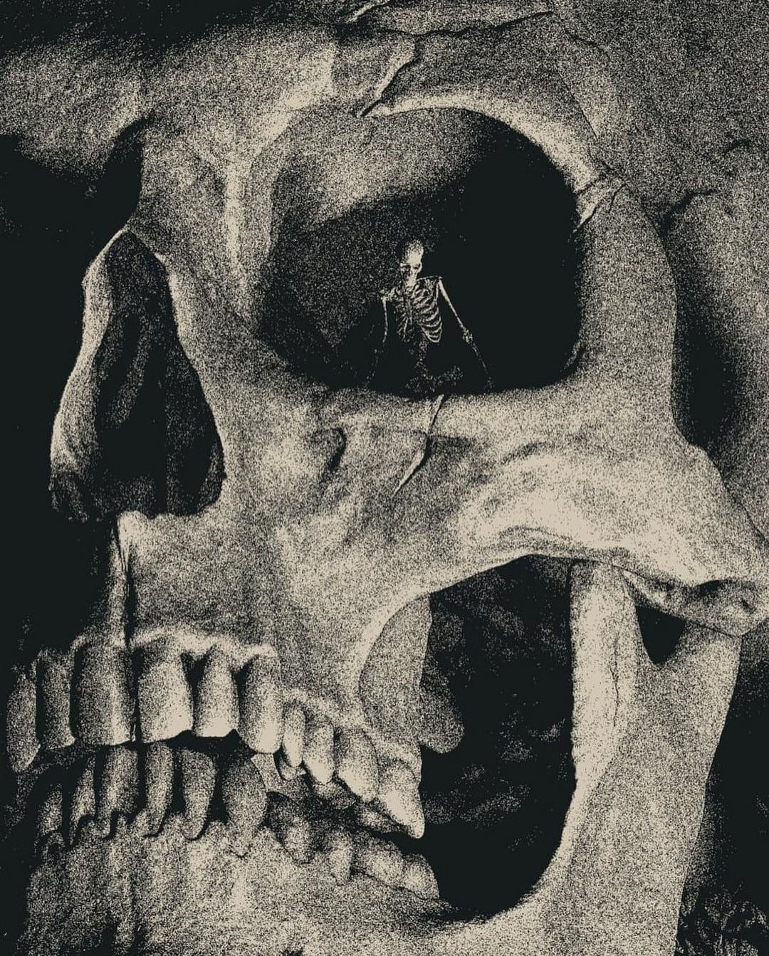 Elle ouvrit la porte. Et d’abord, en pénétrant dans une large pièce, j’eus soudain l’impression comme d’une vaste blancheur, pleine de trous d’ombre et de grimaces, et, tout d’un coup il m’apparut qu’il y avait là une grande réunion, une exposition de crânes. Par plans dégradés, des tablées de crânes tout blancs : tous en files serrées et parfaitement alignées, comme dans un régiment passant la revue, comme sur les étagères d’un liquoriste, un peuple immobile et clair, plein de regards.