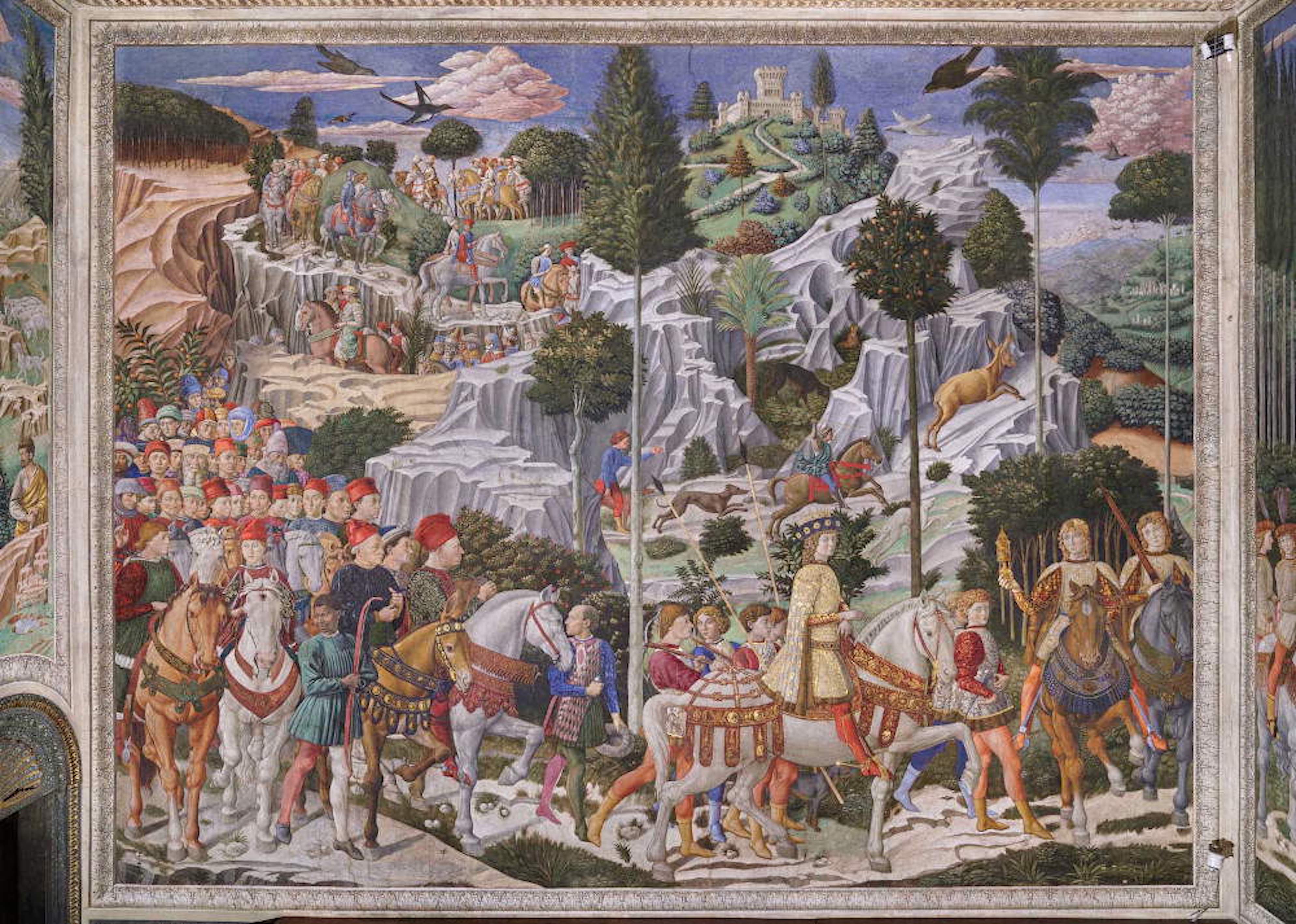 « Ainsi, dis-je, vous refusez de me raconter comment les Rois-Mages processionnaient autour de ces collines, avec tous les petits chevaux en bois, bridés d’or et sellés de velours, qui semblaient échappés d’une boîte de joujoux, et les girafes, et les singes, et les lynx, et aussi les petits pages-poupées soufflant dans de minuscules trompettes ? Et pourtant, c’est ici qu’ils vinrent, je le sais ; j’ai vu ce paysage dans les tableaux et je le reconnais : ce sont bien là les collines polies par les eaux et devenues semblables aux mamelles de la Diane d’Éphèse ; ce sont bien les rangées de cyprès et de sapins, tirés, eux aussi, de la boîte de jouets. Oui, c’est ici-même qu’ils sont venus ; Benozzo Gozzoli a peint tout cela en son temps et, alors déjà, vous habitiez ces lieux, je présume ? »