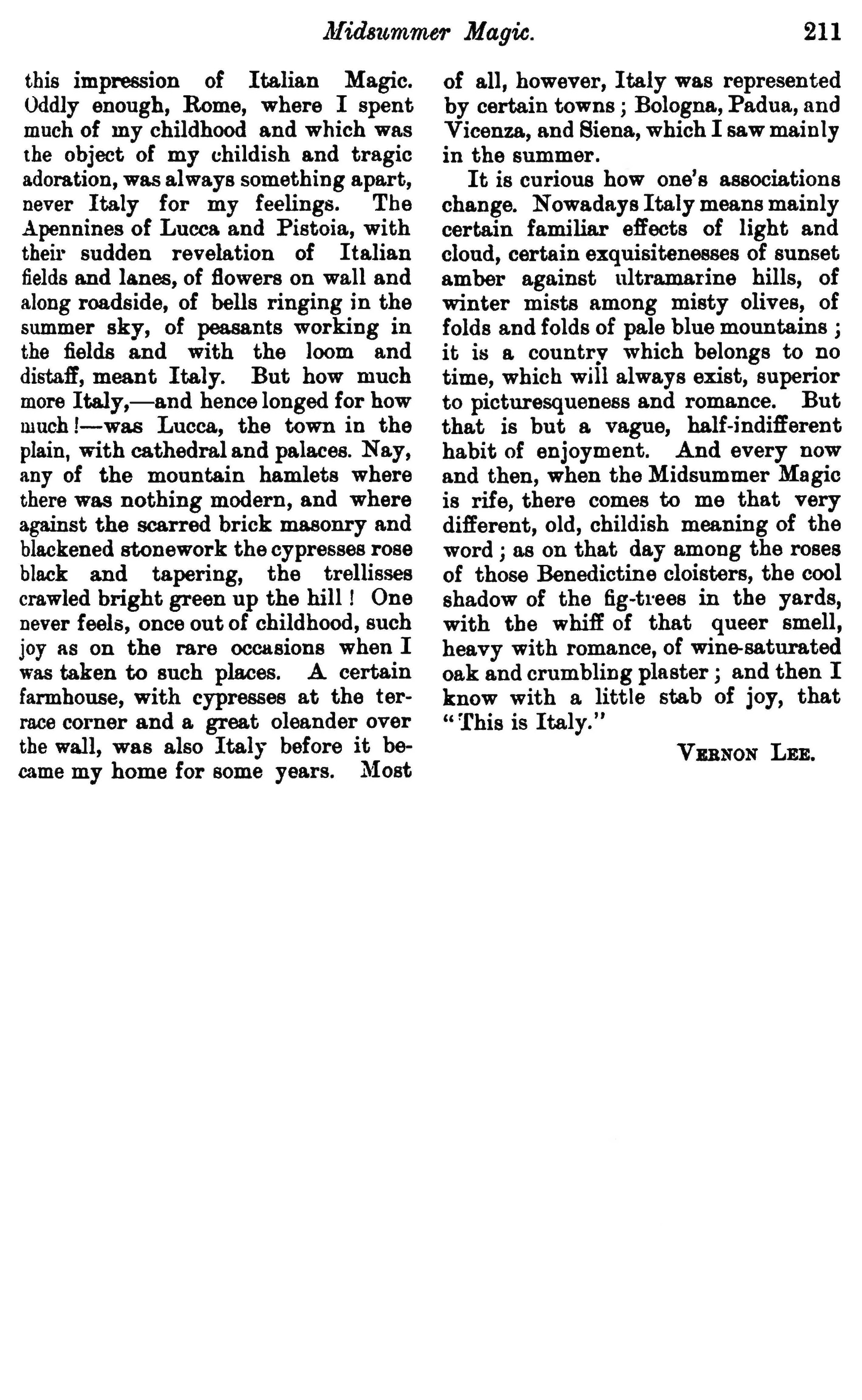 Comme nos associations d’idées se modifient : c’est étrange ! Aujourd’hui, ce mot d’Italie exprime, surtout pour moi, certains effets familiers de lumière et de nuages, la délicatesse exquise du couchant aux lueurs d’ambre contre l’outremer des collines, des brumes d’hiver parmi les oliviers brumeux, des plis et des replis de montagnes bleu-pâle ; c’est un pays qui n’est d’aucun temps, et bien plus beau que toutes les imaginations des peintres et des littérateurs. Mais c’est là une jouissance vague, à demi-indifférente. Et, de temps en temps, lorsque la magie d’été est dans son plein, l’autre… la vieille et enfantine signification du mot me revient : comme le jour où j’étais parmi les roses du cloître bénédictin, à l’ombre fraîche des figuiers de la cour, où je respirais les bouffées de cette odeur étrange, lourde, d’une douceur romanesque, odeur de chêne saturé de vin, et de plâtre qui s’effrite… Et je sens avec un tressaillement de joie que « c’est bien l’Italie. »