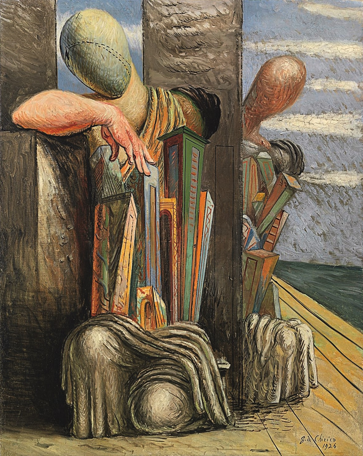 (Giovanni Papini, traduit par Julien Luchaire, in La Revue, volume soixante-six, n° 2, mardi 15 janvier 1907. « L’ultima visita del gentiluomo malato » est parue dans le recueil Il tragico quotidiano, Firenze: Francesco Lumachi, 1906. La nouvelle de Papini a connu de nombreuses traductions par la suite ; on peut notamment mentionner celle de Paul-Henri Michel, sous le titre : « La Dernière Visite du Chevalier malade, » dans l’Anthologie du fantastique, Paris : Club français du livre, [1958], ou encore celle de Nino Frank, dans le recueil Le Miroir qui fuit, « Bibliothèque de Babel » n° 7, Éditions Retz-Ricci, 1978. Giorgio de Chirico, « Le Trouble du philosophe, » huile sur toile, 1926)