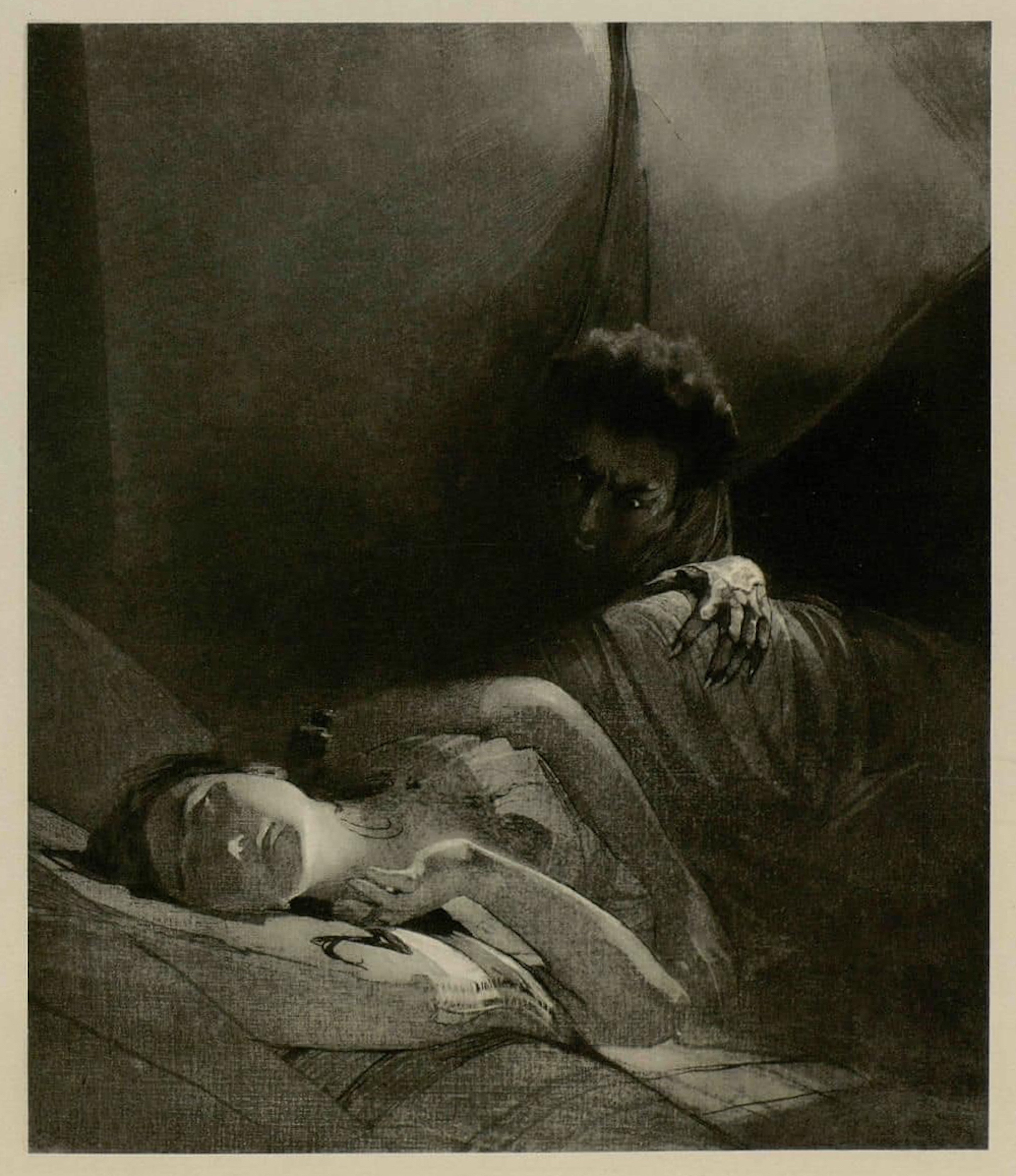 (Léon Combes, in Le Fraterniste, organe de l’Institut général psychotique, quatrième année, n° 179, vendredi 1er mai 1914 ; ce texte est précédemment paru en trois livraisons dans L’Initiation, revue philosophique des Hautes Études, volumes 72 et 73, vingtième et vingt-et-unième années, n° 11, 12, et 2, août, septembre et novembre 1906. Alfred Rudolfovich Eberling, « Tamara et le Démon, » illustration pour le poème de Lermontov, « Le Démon, » St Petersburg: M. O. Volf, 1910)
