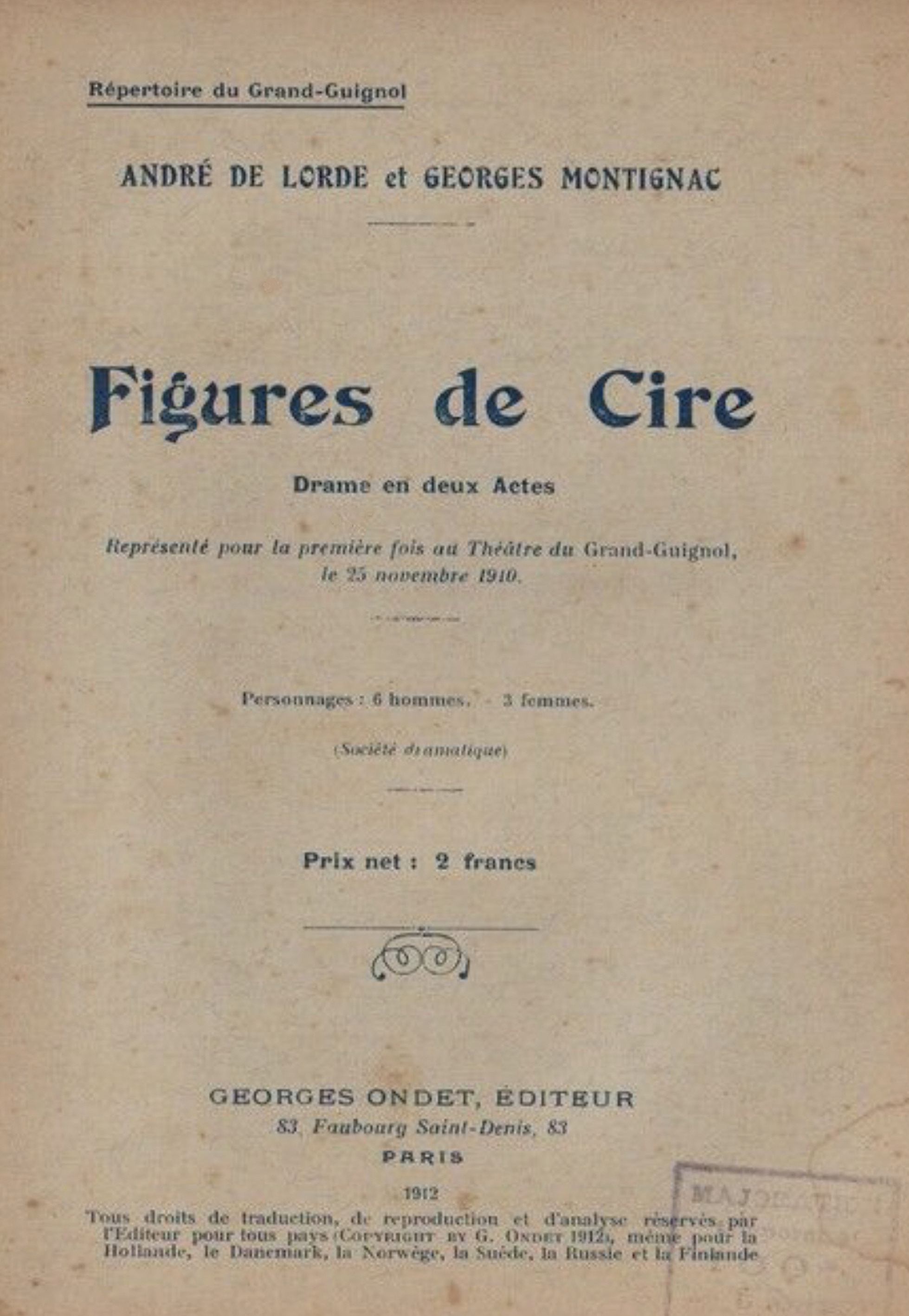☞ La pièce d’André de Lorde et Georges Montignac a fait l’objet de plusieurs adaptations cinématographiques, à commencer par le court-métrage de Maurice Tourneur, 1914, avec Henry Roussel [Pierre de Lionne], Henri Gouget [Jacques] et Émile Tramont [L’Homme aux figures de cire].
