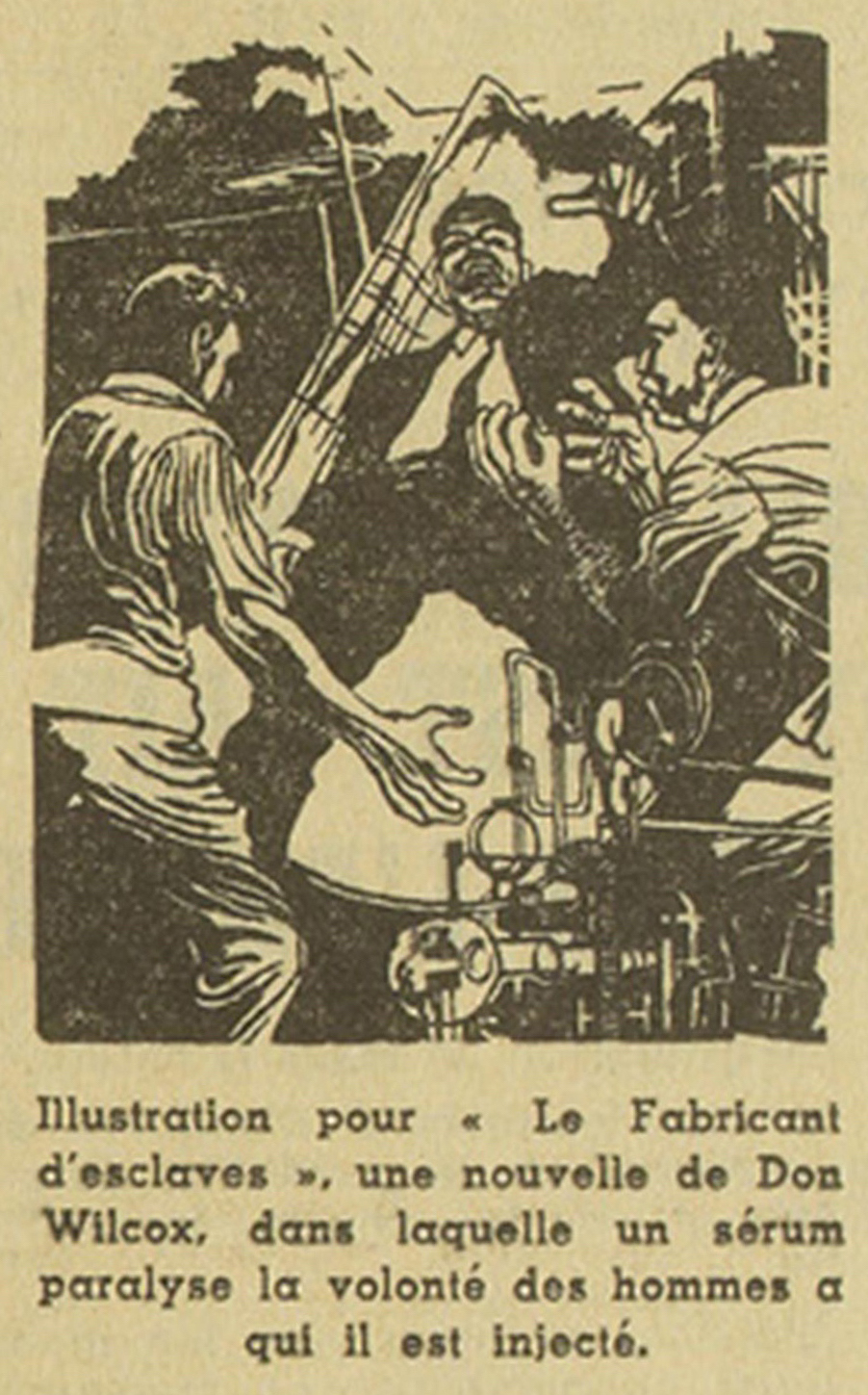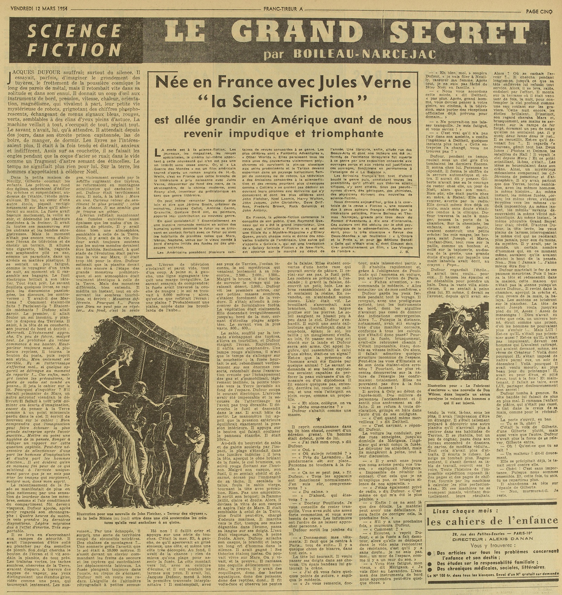 Les écrivains français ont tout d’abord boudé le genre puis, constatant toutes les possibilités qu’il offrait aux théories scientifiques, s’y sont attelés. Sous des pseudonymes divers, des géologues, des chimistes, des physiciens écrivent des nouvelles de science-fiction. Nous donnons aujourd’hui, grâce à la courtoisie de la revue « Fiction, » une nouvelle due à deux auteurs français révélés par la littérature policière, Pierre Boileau et Thomas Narcejac, grands prix tous deux du Roman d’Aventures à dix ans d’intervalle. Ces auteurs ont été séduits par le côté psychologique de la science-fiction. Après avoir écrit, pour la très classique « Revue des Deux-Mondes, » un feuilleton : « L’Ombre et la Proie, » et pour les éditions Denoël « Celle qui n’était plus, » dont Clouzot doit tirer prochainement un film, « Les Visages de l’ombre. »