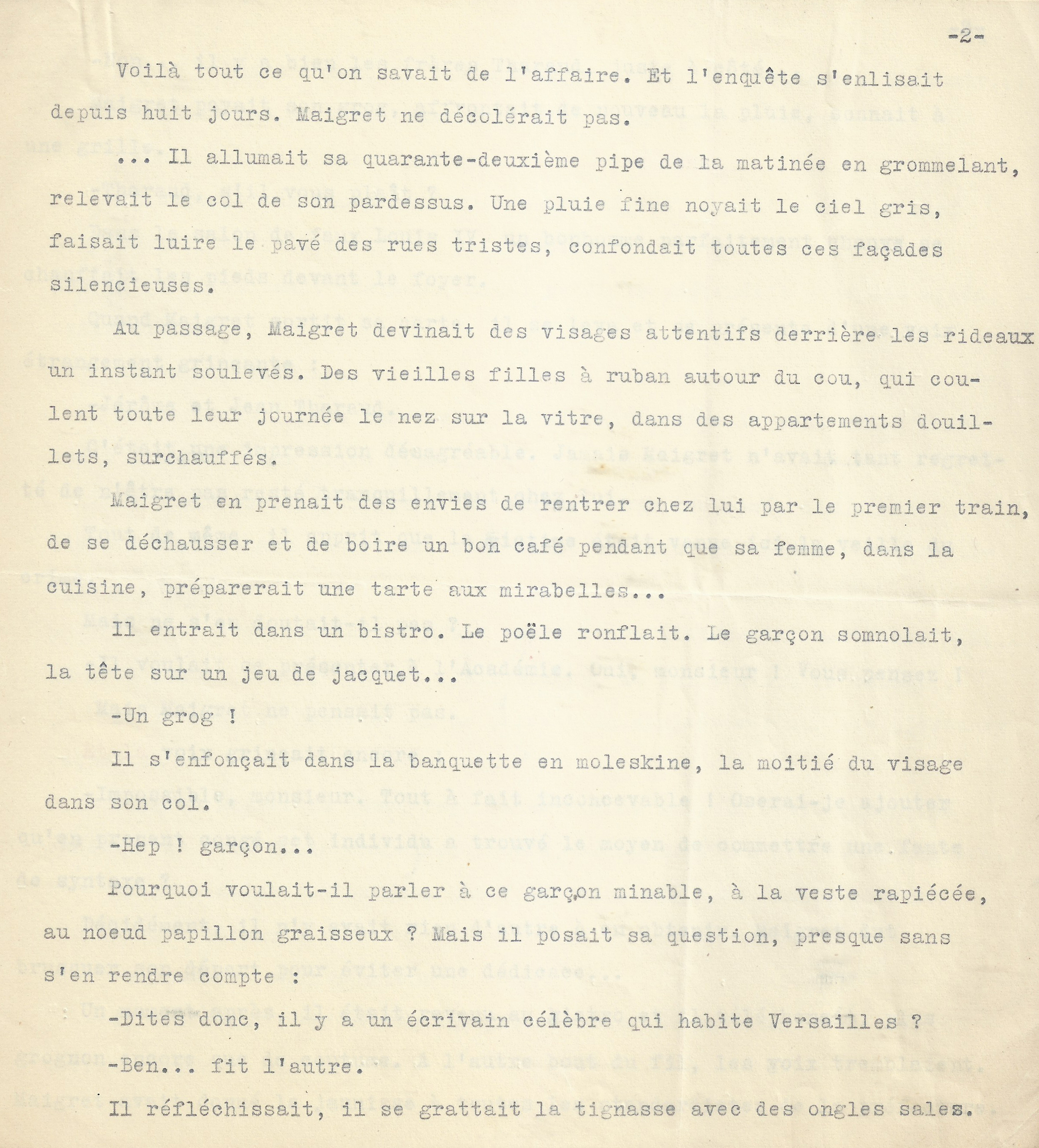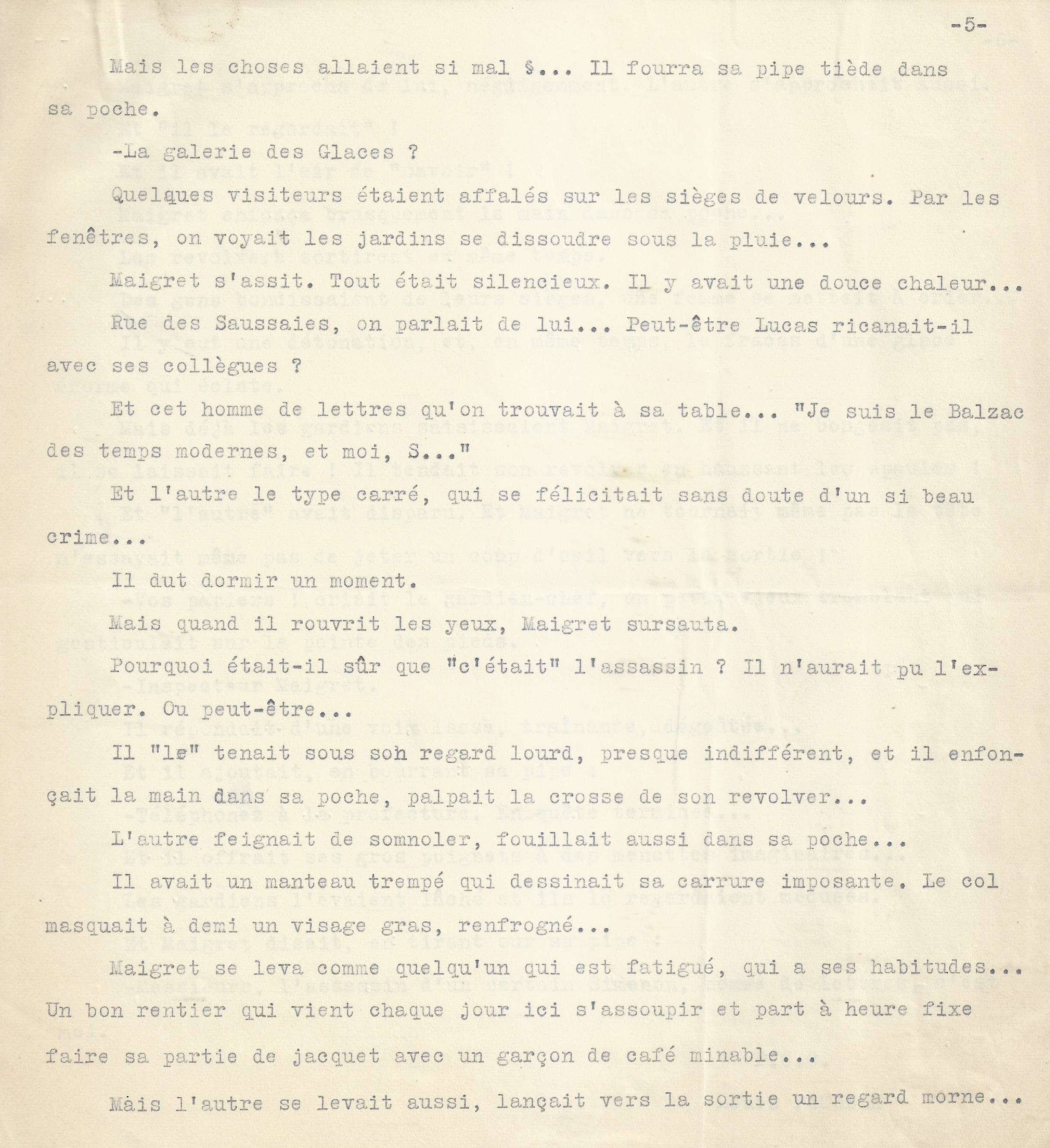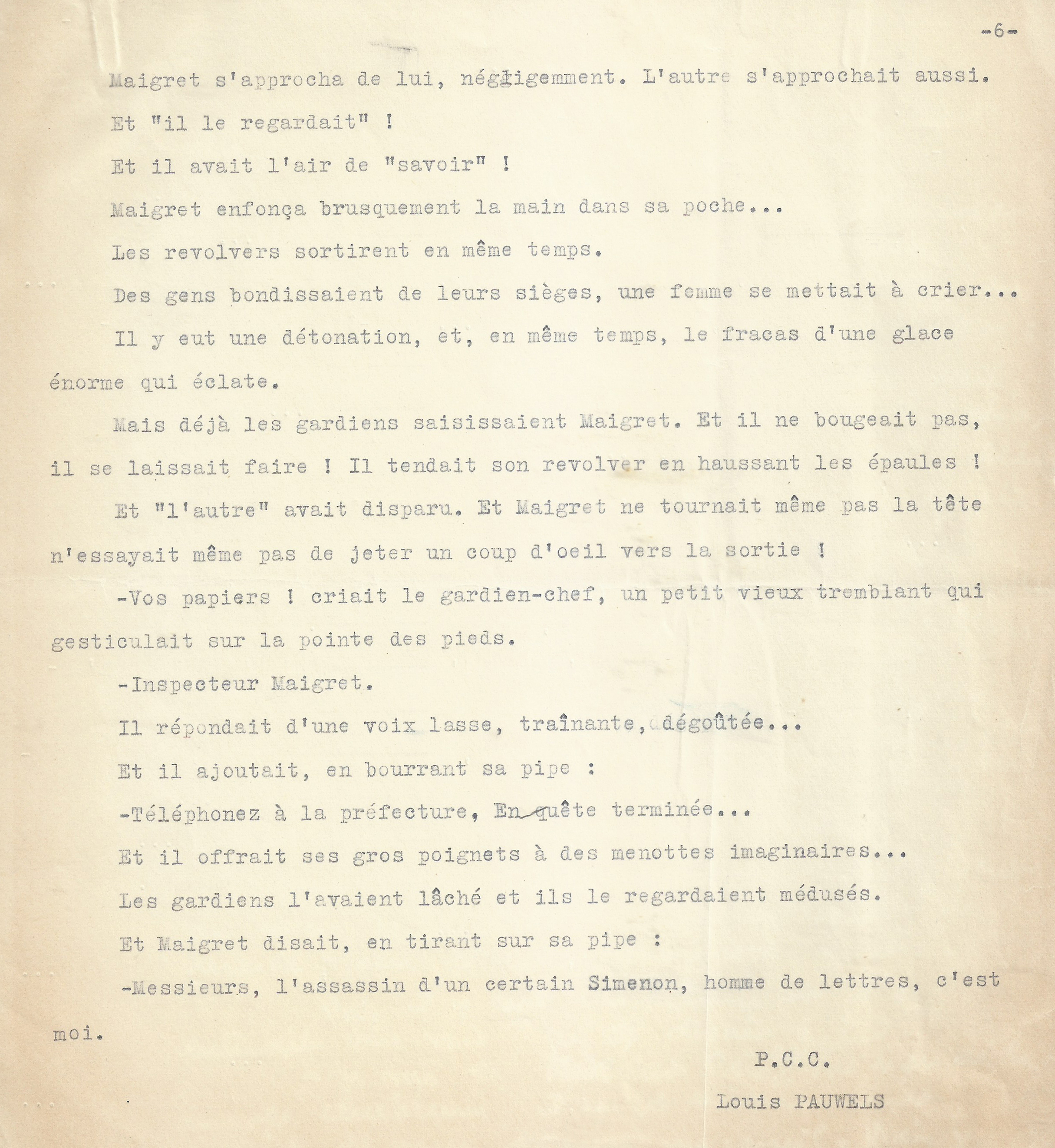 ☞ N’ayant pu retrouver trace de cette « dernière enquête du commissaire Maigret, » nous présumons que ce tapuscrit est resté inédit.