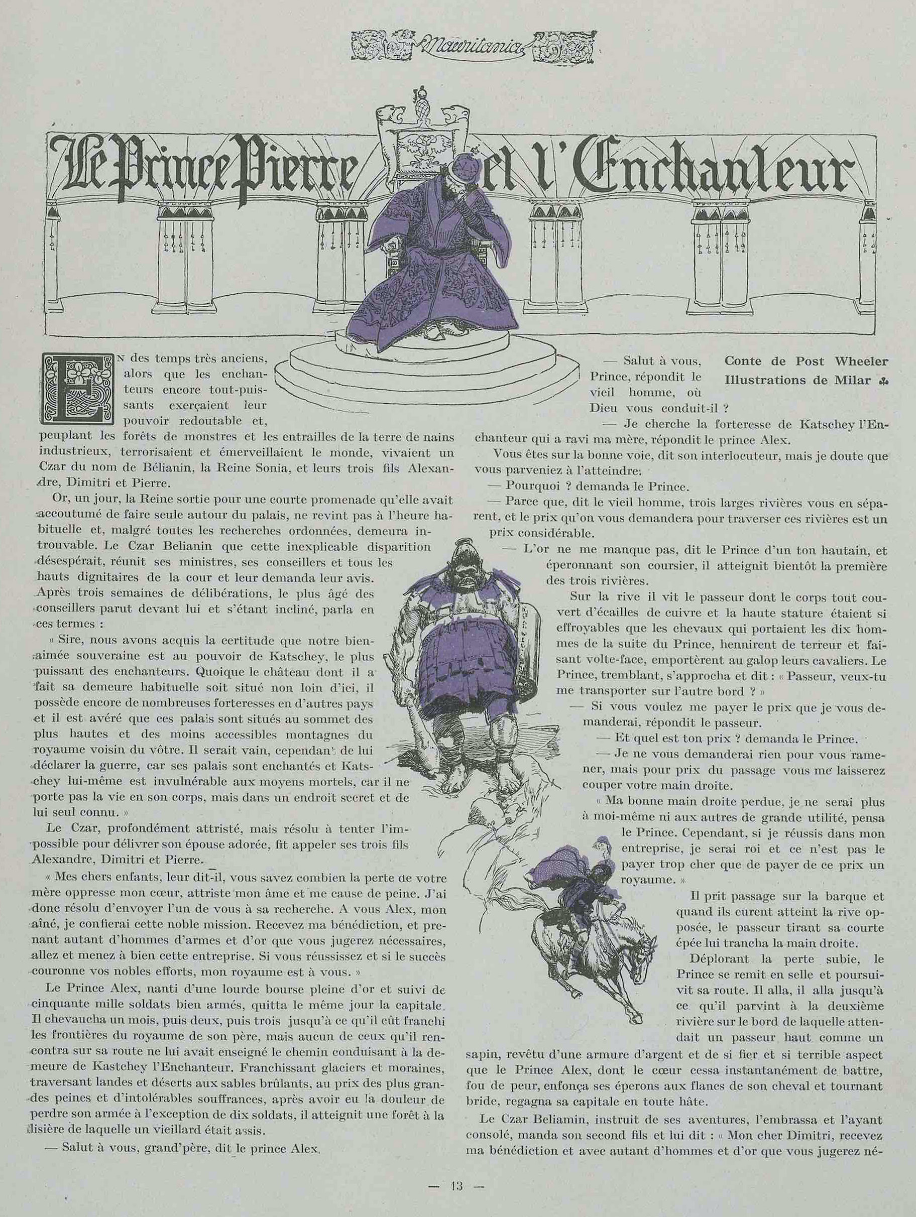 (Post Wheeler, illustrations de Millar, in Mauritania, quatrième année, n° 38, Noël [décembre] 1913 ; ce conte est une adaptation de « Tzarevich Petr and the Wizard, » in Russian Wonder Tales, New York: The Century Co., 1912. Pour une meilleure lisibilité, n’hésitez pas à cliquer sur les images pour les agrandir)
