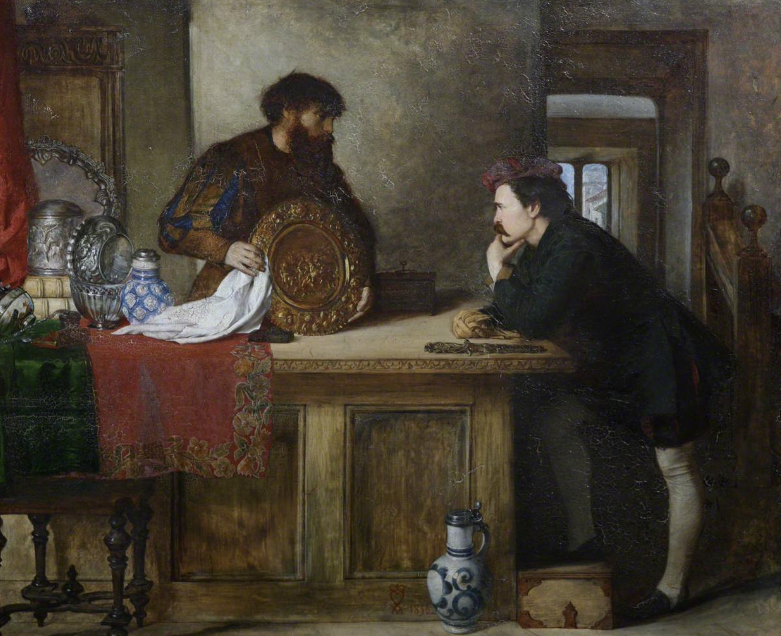 (Paul Heuzé, in Journal des débats politiques et littéraires, cent dix-septième année, n° 97, samedi 8 avril 1905 ; in Annales africaines, revue politique et littéraire de l’Afrique du Nord, trente-cinquième année, nouvelle série, n° 25, 26, 27, 28, 29, 30 et 31, vendredis 6, 13, 20 juillet, 3, 10, 17 et 24 août 1923 ; in Le Petit Méridional, journal républicain quotidien, n° 17474, 17475, 17477, 17478 et 17480, mardi 29, mercredi 30 janvier, vendredi 1er, samedi 2 et lundi 4 février 1924. Cette nouvelle a été reprise en volume dans le recueil éponyme, Paris : Jean Bosc & Cie, 1907 ; elle a également fait l’objet, semble-t-il, d’une édition illustrée séparée en 1924, à l’Édition artistique. William Fettes Douglas, « Benvenuto Cellini selling Plate, » huile sur toile, 1856)