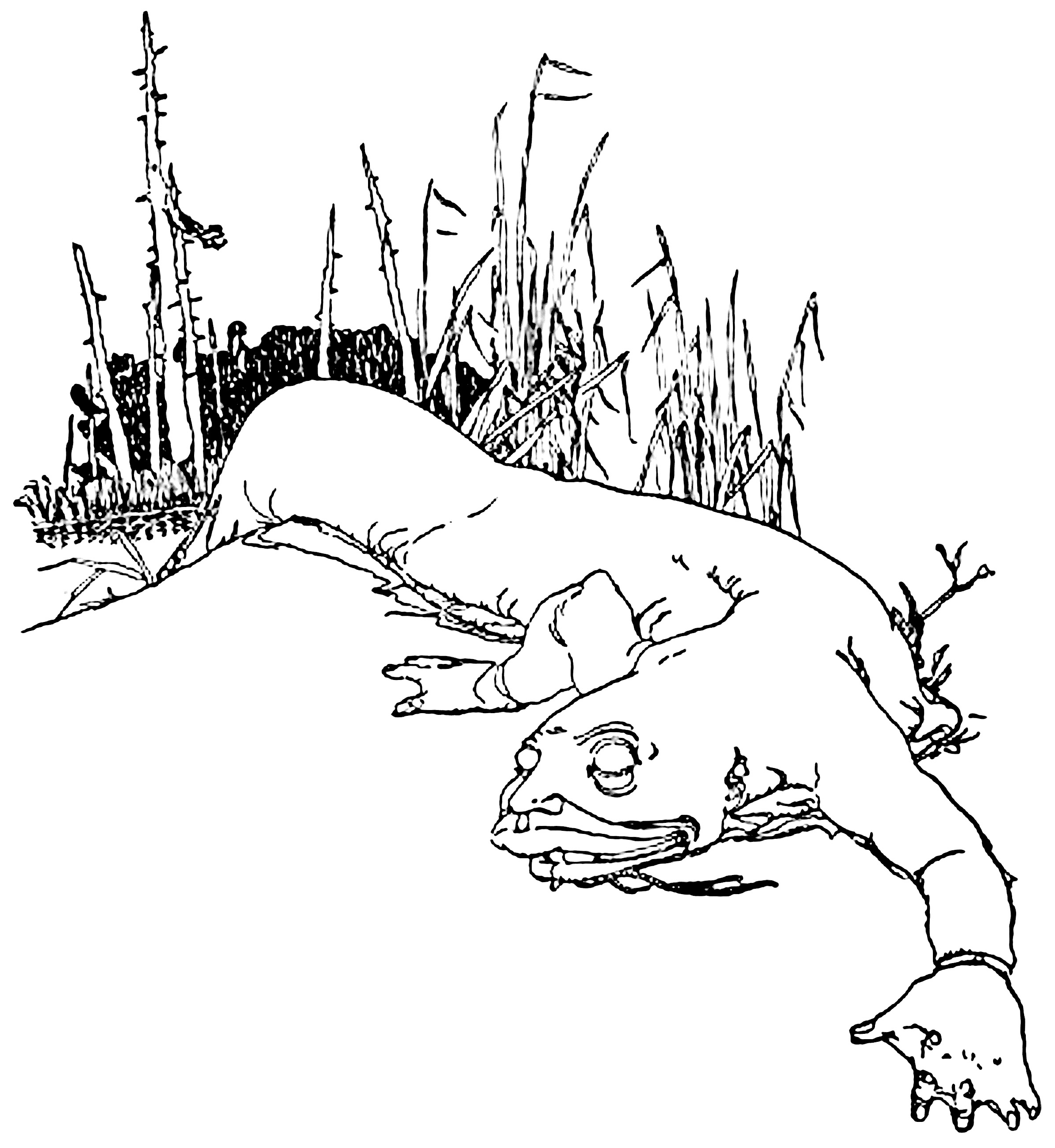 Une autre nuit, on frappa à sa porte… C’était un bruit mou, assimilable à celui que ferait un paquet de linge mouillé lancé sur une planche. La porte ouverte, il n’avait rien trouvé. Sur la porte, la lueur clignotante de sa lanterne lui révéla l’empreinte humide et fraîche de la large patte palmée.
