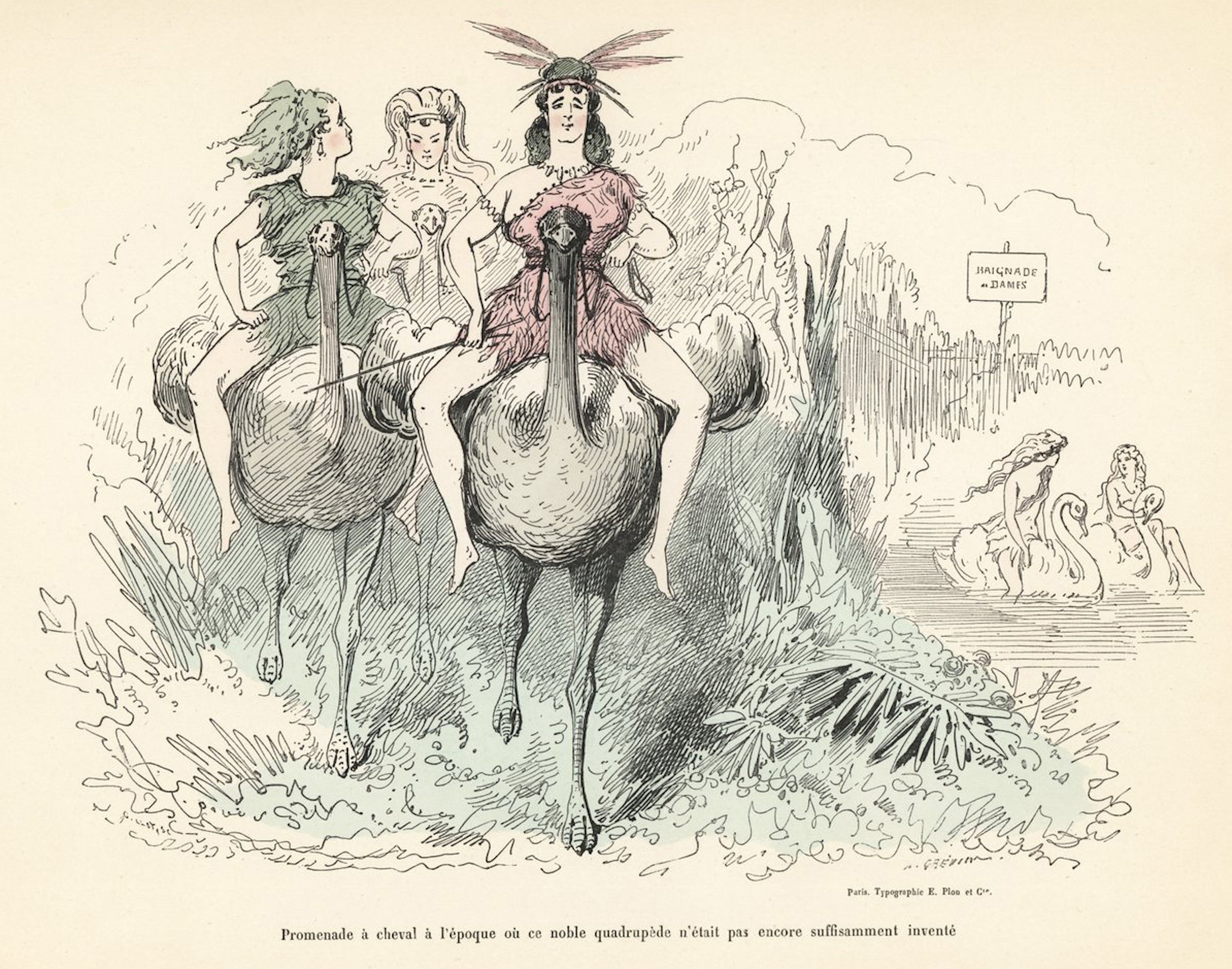 (Constant-Louis Müller, « Les Contes du Journal du Peuple, » in Le Journal du Peuple, sixième année, n° 16, dimanche 16 janvier 1921. « Fortunately some Penguins Arrived on the Island, » gravure d’après Stanley Berkeley, in Chatterbox, 1902 ; « Promenade à cheval à l’époque où ce noble quadrupède n’était pas encore suffisamment inventé, » lithographie de Gilloy, d’après Alfred Grévin, in Les Filles d’Ève, album de travestissements plus ou moins historiques, Paris : Eugène Plon, 1850)