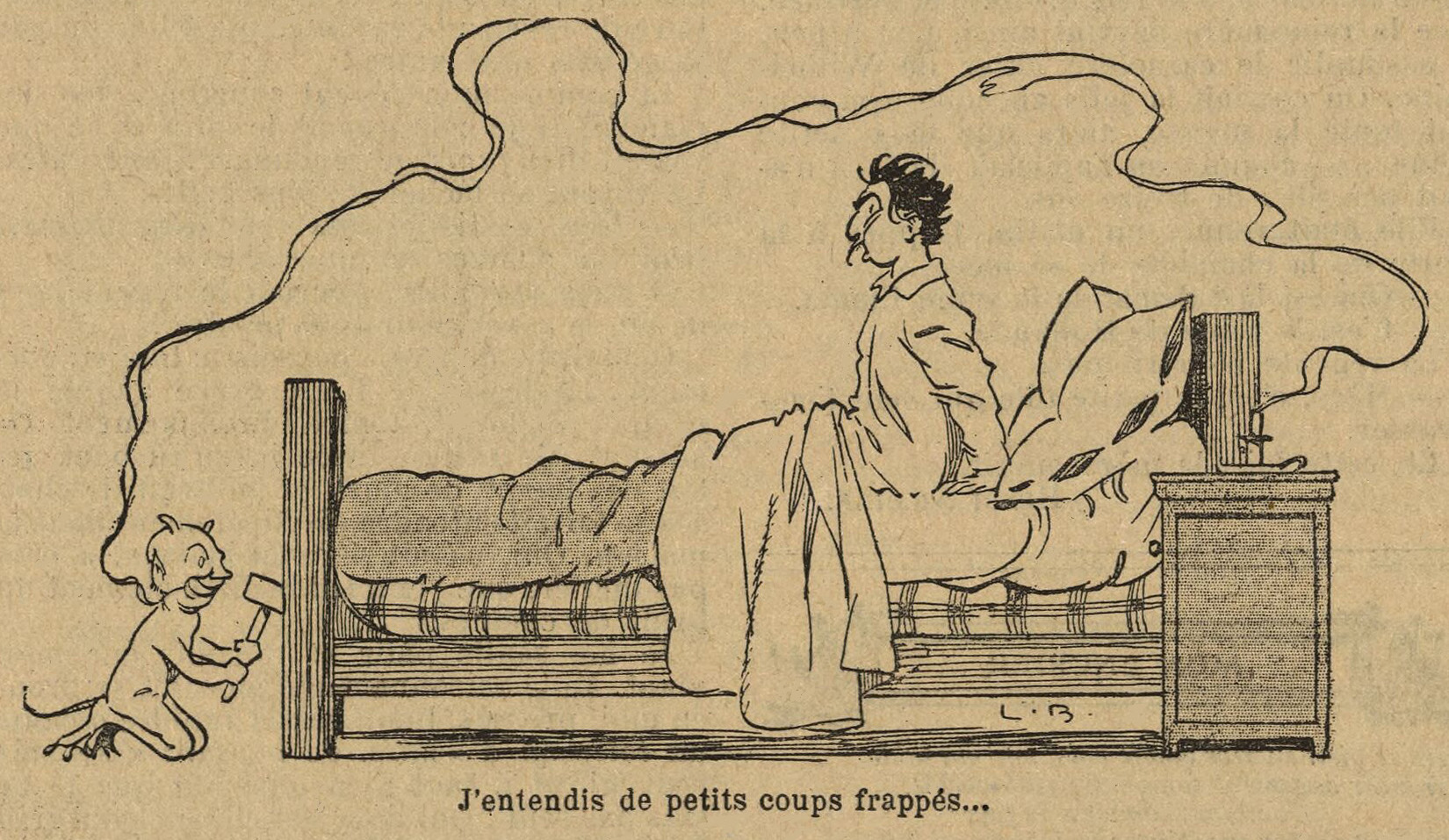 Me voilà donc couché de nouveau, lisant, et à peu près rassuré. Je m’aperçus que mon livre contenait un article sur les hallucinations. Je le cherchai vivement et je lus les choses les plus inquiétantes touchant les maladies du système nerveux. Quand j’arrivai aux erreurs de l’ouïe ; quand je vis comment certains malades sont, nuit et jour, poursuivis par des sonneries de cloches ; comment d’autres hallucinés entendent partout d’invisibles ennemis les persécuter de menaces, je compris qu’une telle lecture n’était pas opportune et je lançai la revue loin de moi, avec colère, en criant à haute voix : « Au diable ! »