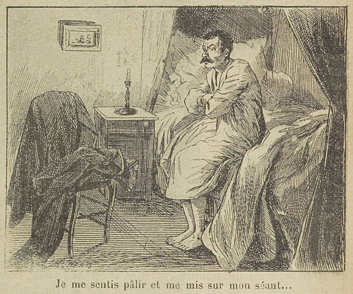 Je me sentis pâlir et me mis sur mon séant. Mille raisonnements aussitôt se firent en moi, pressés, lumineux et rapides comme un faisceau d’éclairs. Je pensais : « Je suis seul ici et il faut bien pourtant que je ne sois pas seul ! Qui donc est entré ? pourquoi faire ? pour voler ? Venir voler en traînant des chaînes, quelle apparence !… Les chiens, d’ailleurs, n’ont pas jappé. Ils sont là, dans l’allée, sous la lune. Mais alors ?… allons donc, je n’y croirai jamais. Des esprits ? des esprits frappeurs ? Pourquoi veut-on que des esprits, êtres subtils tout à fait supérieurs, se livrent à des occupations indignes même d’un bourgeois sérieux, comme celle de réveiller les gens avec des bruits incompréhensibles ! Allons, allons, j’ai mal entendu. Je rêvais funérailles, cordes, chaînes… et il y a de la fièvre, causée par un peu d’embarras gastrique, comme dirait le docteur. Voilà tout. »