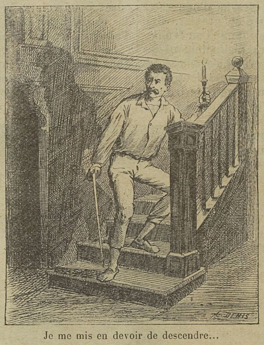 Je me mis en devoir d’opérer une descente. Pieds nus, retenant mon haleine, l’oreille aux aguets, je descendis lentement, lentement, toujours sur mes gardes, les yeux écarquillés, le cœur à la fois plein de hardiesse et d’épouvante. Avec quel plaisir j’aurais rencontré une bande de voleurs ou de sorciers ! car il fallait à tout prix trouver, voir, palper la cause extérieure, naturelle ou surnaturelle, la cause, la cause, ô mon âme, ou conclure à l’hallucination, à la folie !…