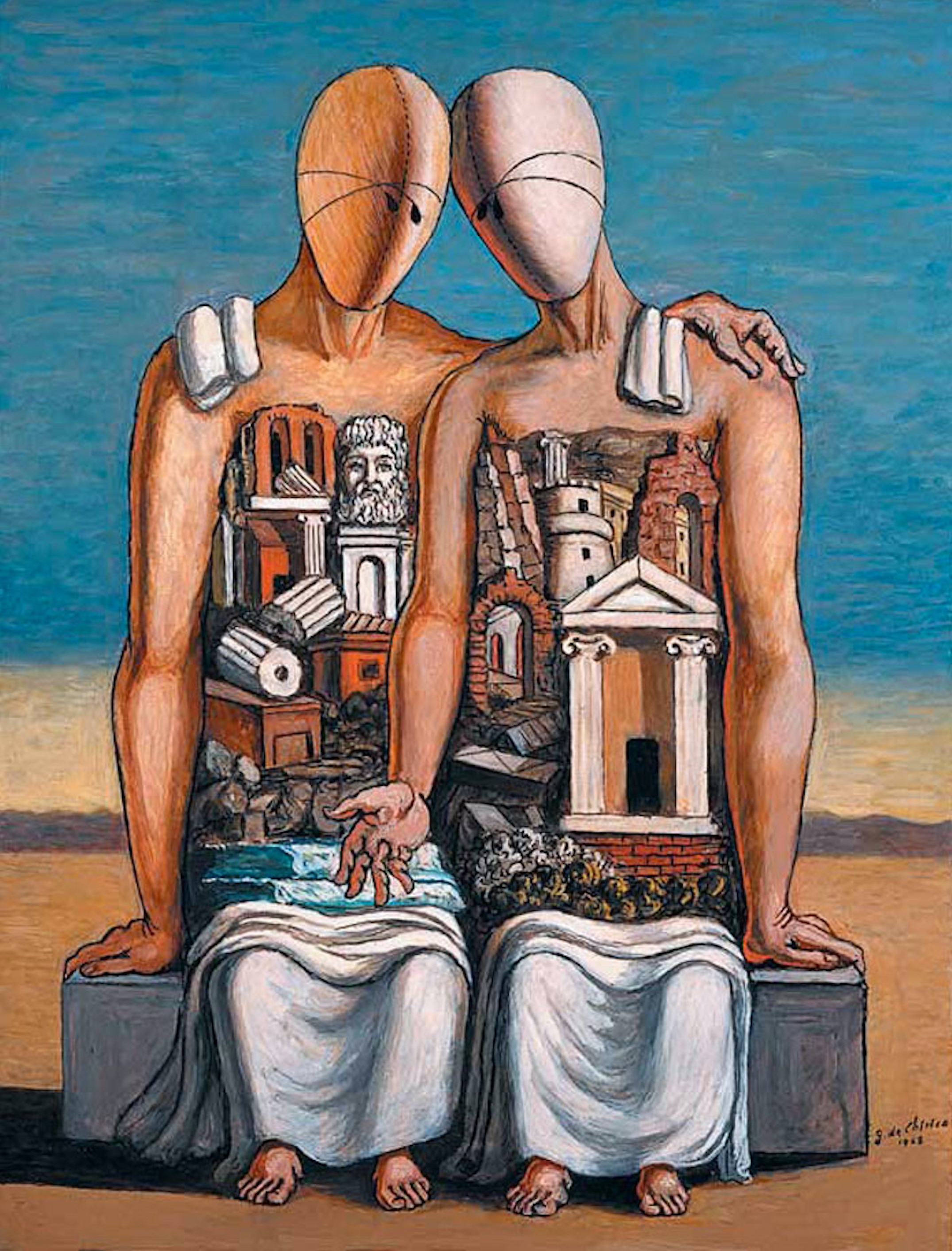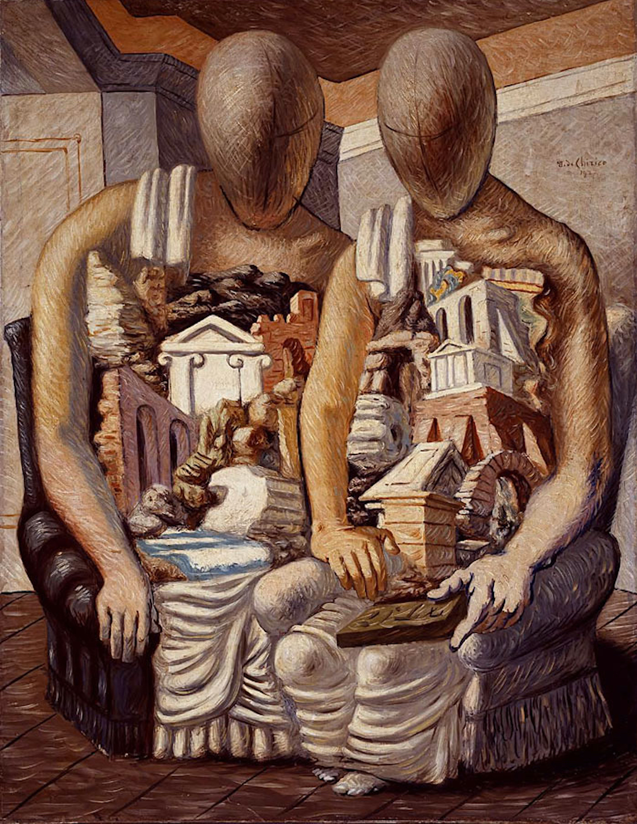 (Massimo Bontempelli, traduit par Nino Frank, in La Revue mondiale, quarante-et-unième année, volume 199, août 1930 ; la nouvelle originale est parue sous le titre : « Terzo Viaggo, » dans le recueil Viaggi e scoperte. Ultime avventure, Firenze: Vallechi Editore, 1922. Giorgio de Chirico, série « Gli Archeologi » et « L’Archeologo solitario » huiles sur toile, 1927, 1968 et c. 1937 )