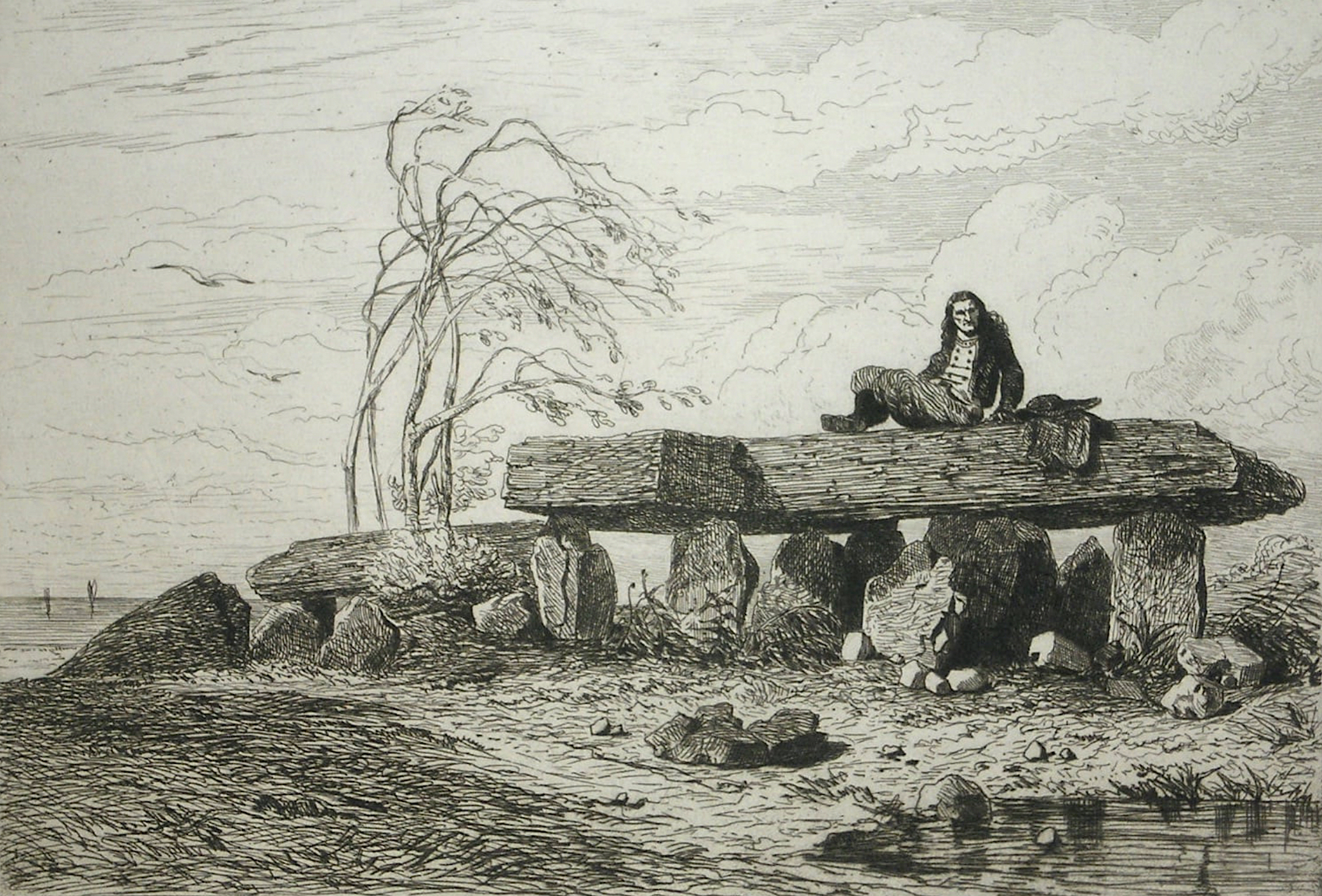 (Rachilde, « Variétés, » in L’Estafette, lundi 12 août 1878 ; sous le titre : « Une Histoire bretonne, » in L’École des femmes, première année, n° 17, jeudi 23 octobre 1879. Léon Gaucherel et Auguste Delâtre, « Dolmen de Locmariaker, » Paris : Société des aquafortistes, eaux-fortes modernes originales et inédites, première année, dixième livraison, 1863)