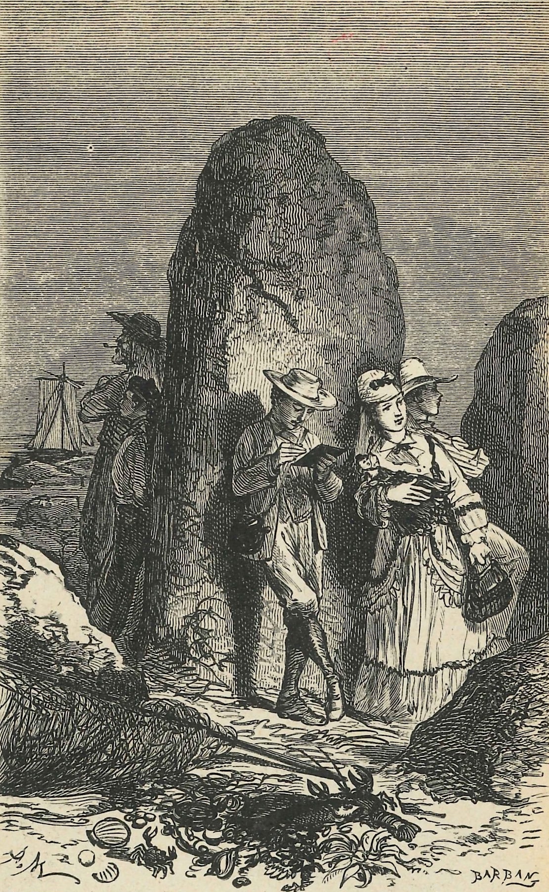 (Rachilde, in Le Scapin, deuxième année, n° 8, deuxième série, décembre 1886 ; « Au Bord de la mer, » gravure sur bois d’A. Marie pour En Congé de Zénaïde Fleuriot, Paris : Librairie Hachette et Cie, collection « Bibliothèque rose illustrée, » 1874)