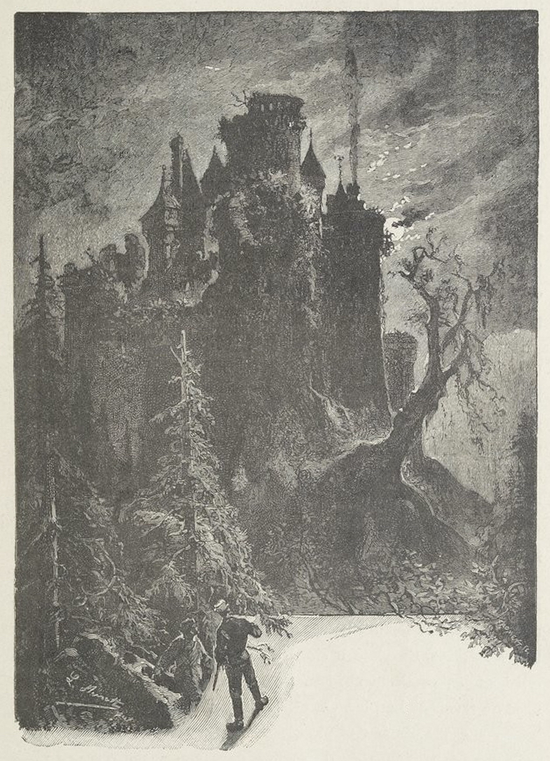 (Albert Dupuis [alias Albert Lhermite], in L’Artiste, revue hebdomadaire du Nord de la France, première année, n° 3, 4 et 5, dimanches 23, 30 juin et 7 juillet 1850. Illustration de Léon Benett pour Le Château des Carpathes de Jules Verne, Paris : J. Hetzel et Cie, 1892)