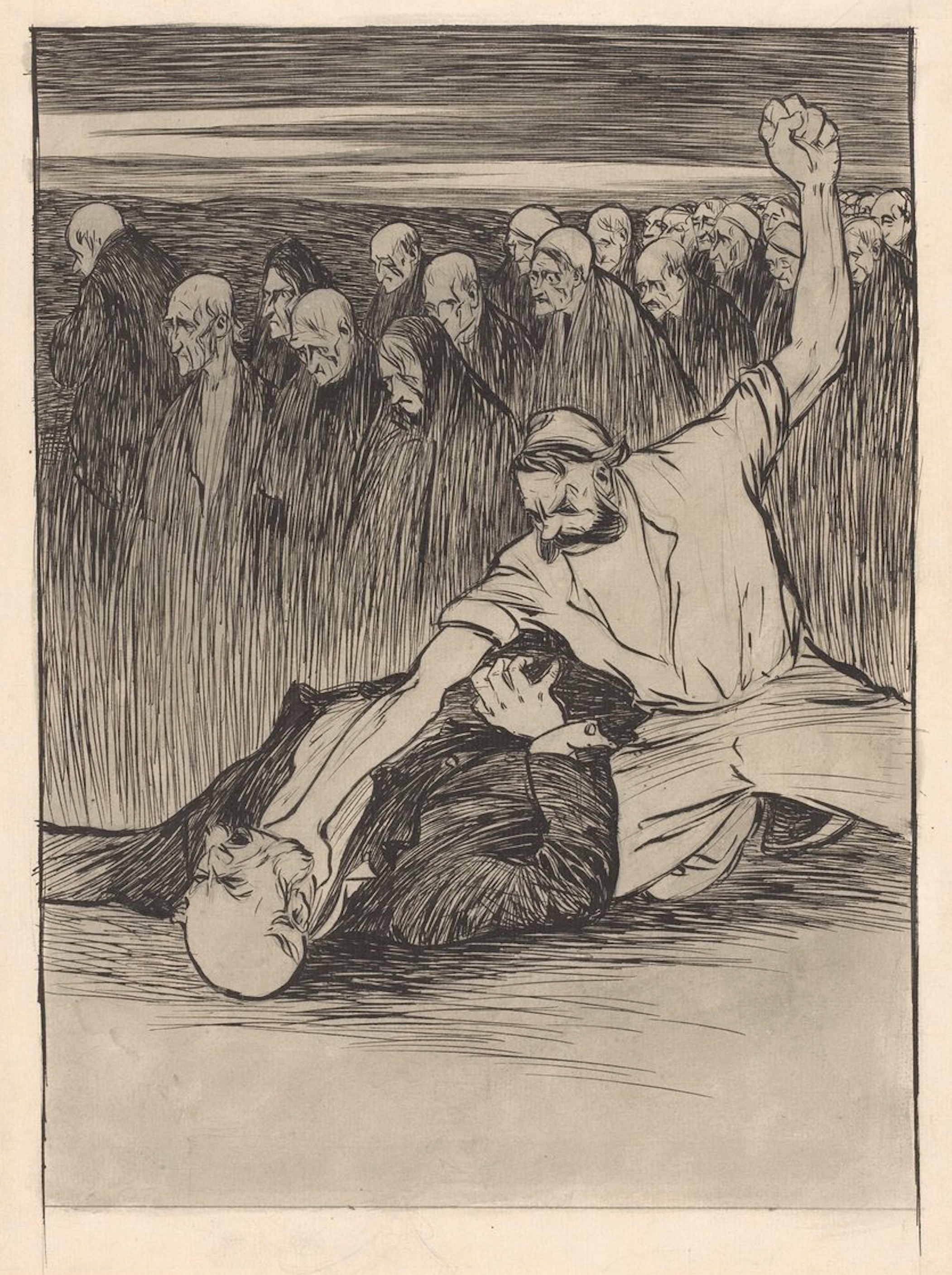 Les ouvriers, silencieux, levèrent les yeux vers le sage ; immobiles, ils écoutaient ses paroles raisonnables ; et plus il parlait, plus leurs visages se fermaient et prenaient un air froid et sombre. Soudain, l’un d’eux, s’adressant son camarade, s’écria :
