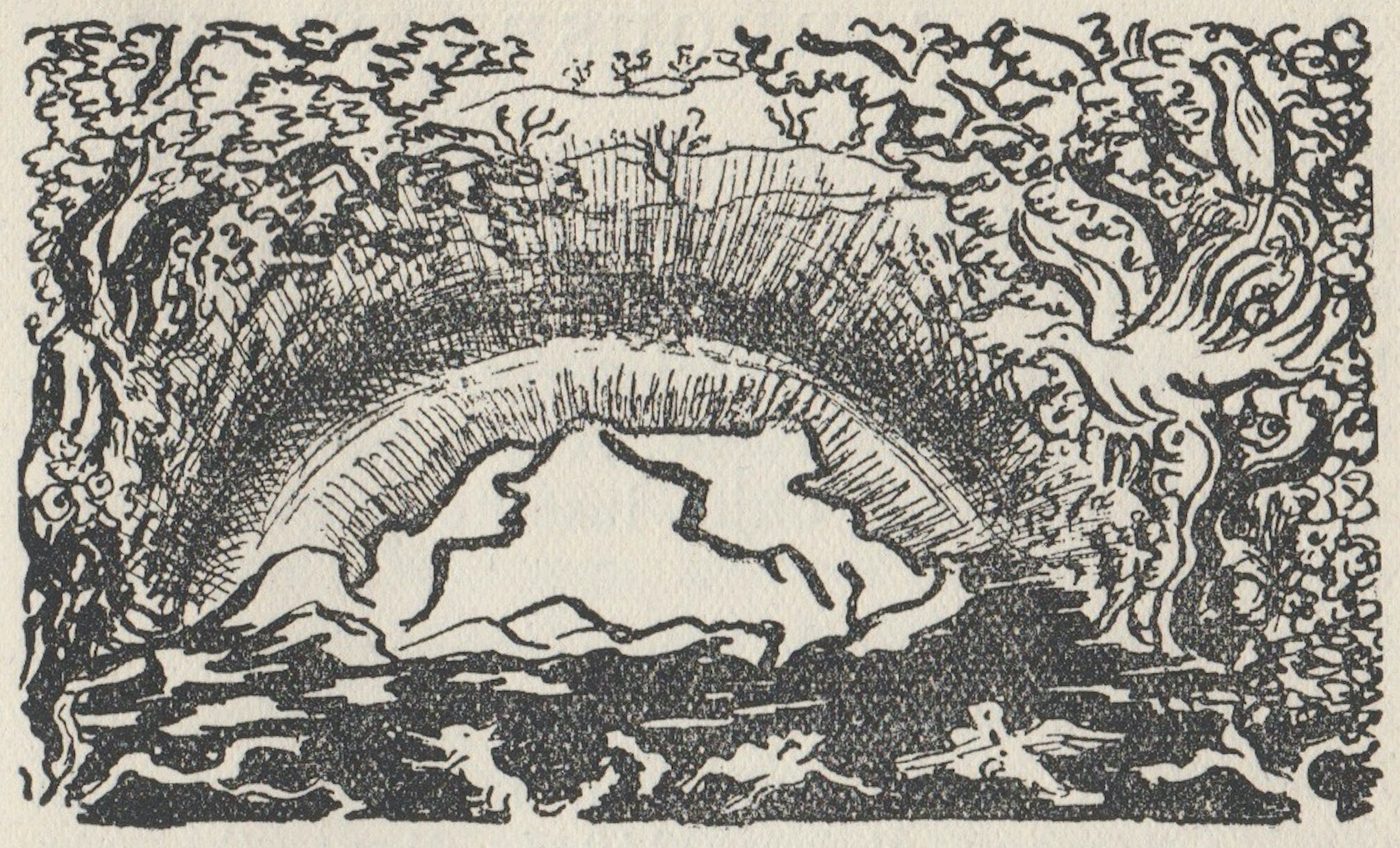 Alors, tout ce qui vivait encore et respirait auprès de cette zone foudroyée s’enfuit loin, très loin, rejoindre le petit peuple à fourrure des forêts et des eaux, et la gent à plumes des hautes branches, et tout ce qui rampe, et vole, et détale…