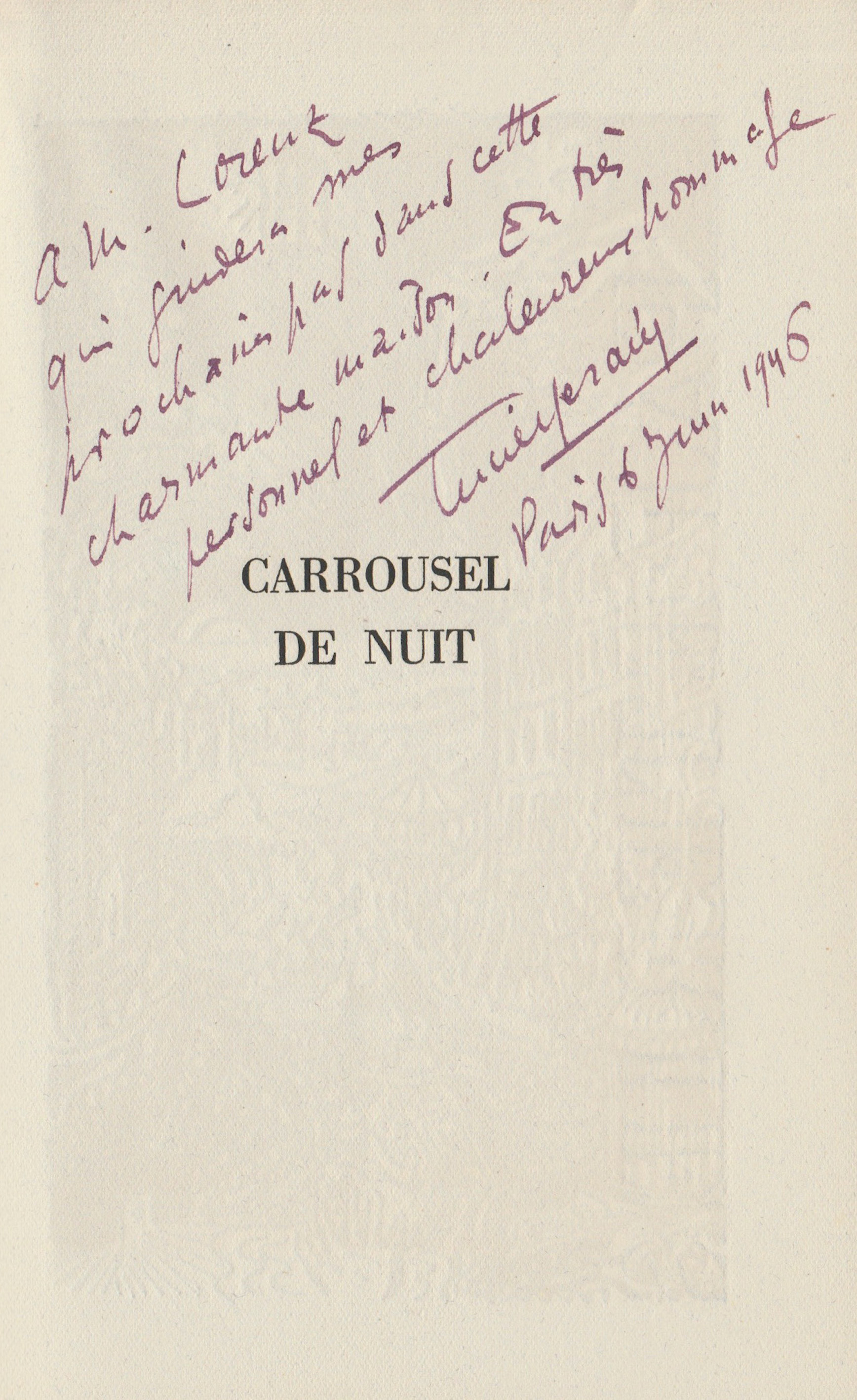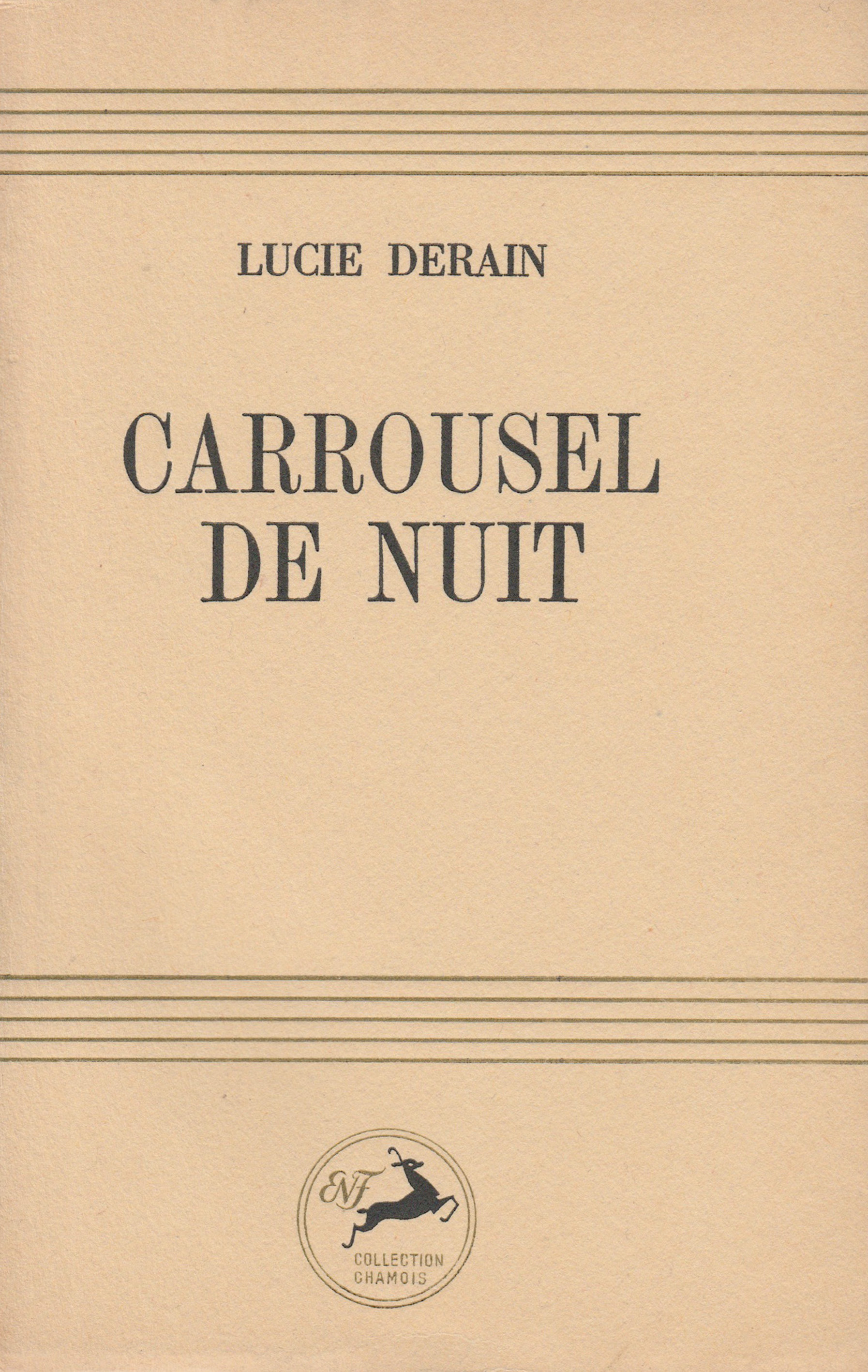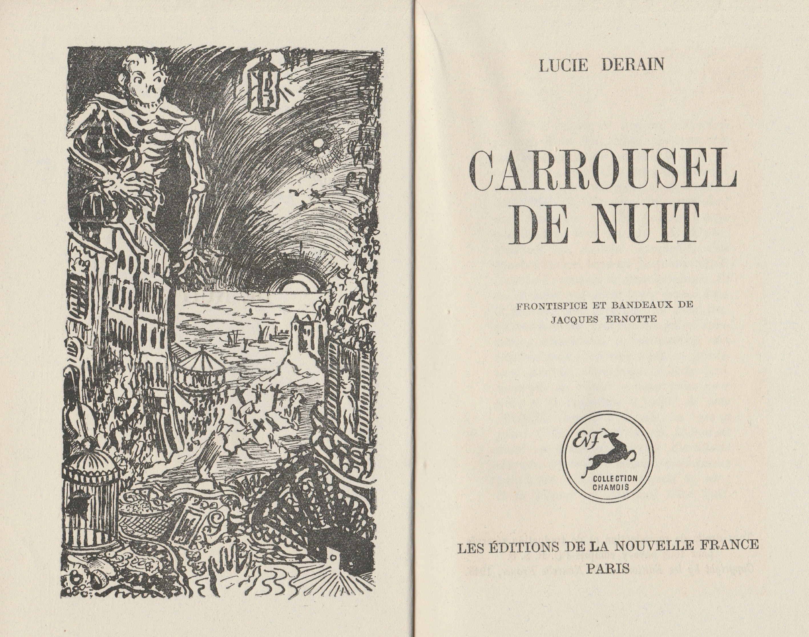 (Lucie Derain, Carrousel de nuit, frontispice et bandeaux de Jacques Ernotte, Paris : Les Éditions de la Nouvelle France, collection « Chamois, » n° 12, 1946)