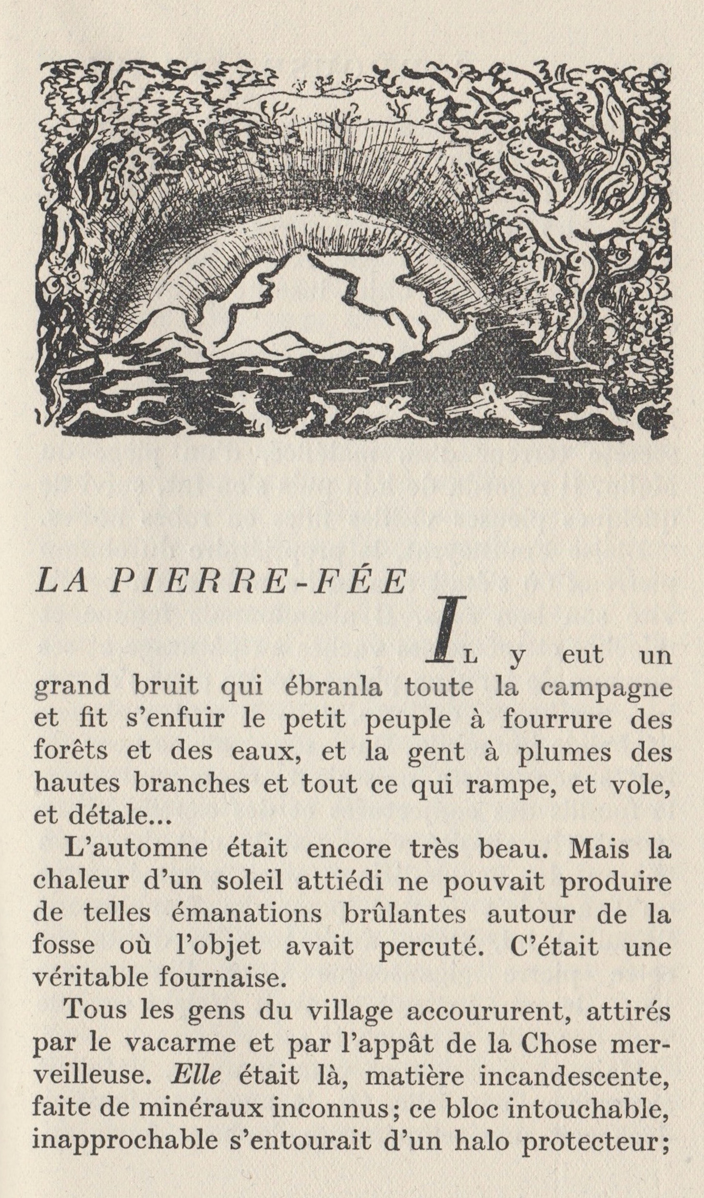 Cette fois, la capitale s’émut et délégua des observateurs. Ils vinrent fouiller, bouleverser le champ du miracle. On annonçait une mission scientifique chargée de peser, mensurer le morceau tombé de l’espace erratique, et d’en déterminer exactement la composition. Ce fut l’ère des métamorphoses. Il n’y eut pas que le végétal pour s’embellir et se renouveler. Tout le monde animal, et surtout la peuplade ailée qu’un hiver terrible exile pour de longs mois, hanta les parages du bolide. Au-delà du périmètre influencé par la masse minérale, la neige, la glace, le brouillard emprisonnaient l’air et la terre. Mais dans un rayon de cent mètres autour de la « Pierre-Fée, » la nature et les êtres vivaient affranchis du morne Temps. Pinsons et bouvreuils, moineaux et rouges-gorges accomplissaient sans le savoir une adorable transmutation. Heure par heure, leurs plumes devenaient plus colorées, plus féeriques. La « Pierre-Fée » transformait ces enfants de nos ciels brumeux en oiseaux des Îles, au plumage brillant, au jacassement berceur.