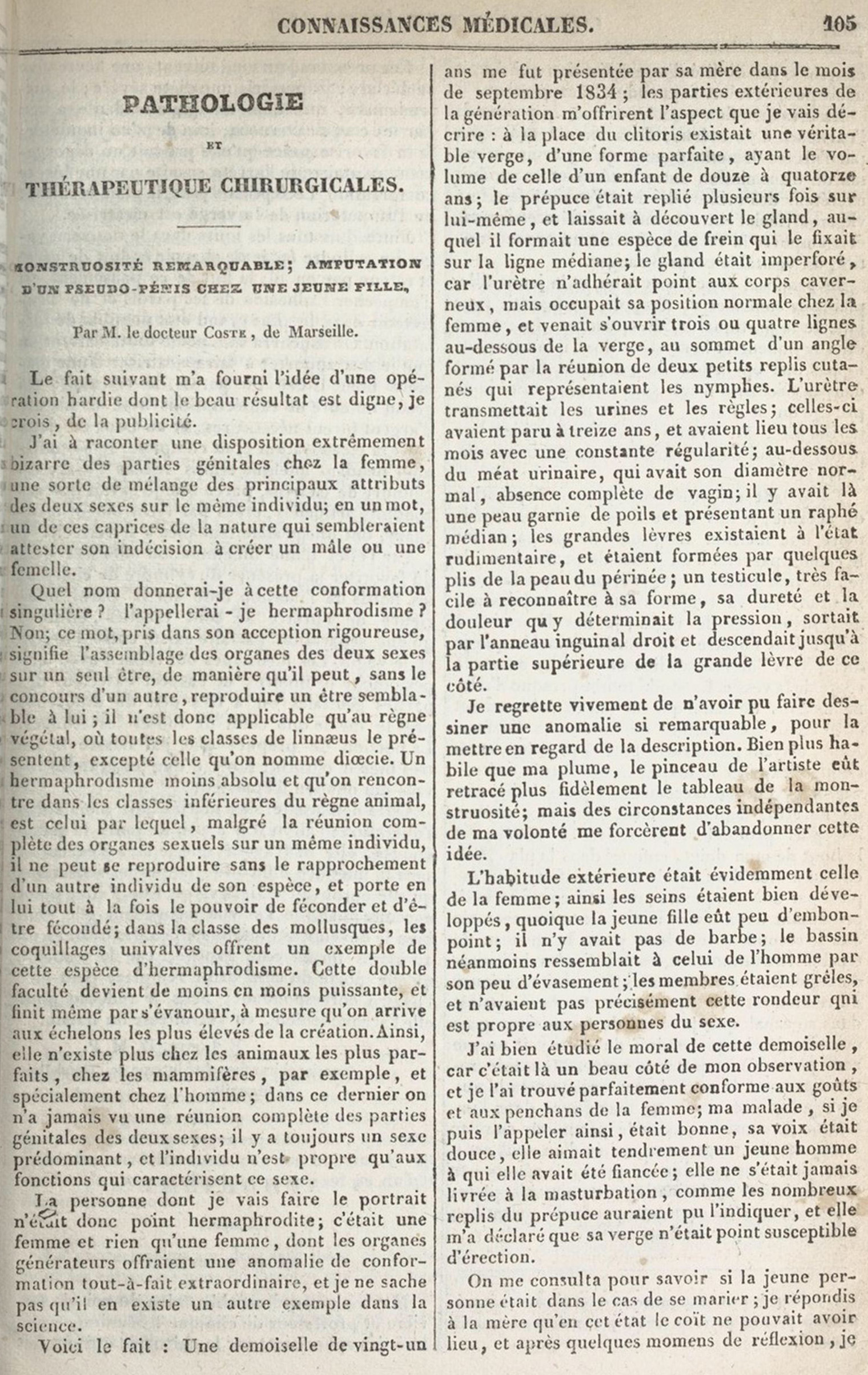 En septembre 1834, une jeune fille de 21 ans fut présentée au Dr Coste. À la place du clitoris, elle avait une véritable verge, ayant le volume de celle d’un enfant de 14 ans :