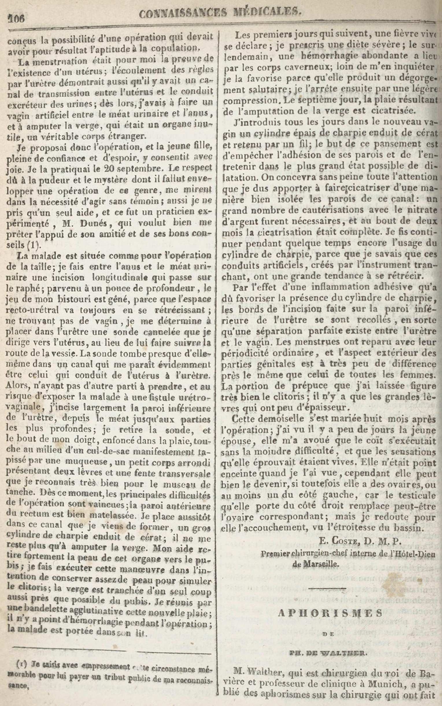 Le 7 octobre 1835, le Dr E. Coste, « premier chirurgien et chef interne de l’Hôtel-Dieu de Marseille, » écrivait au rédacteur du Journal des Connaissances Médico-Chirurgicales pour lui rendre compte d’une délicate opération qu’il venait de pratiquer sur une jeune fille hermaphrodite et qu’il avait eu l’habileté, ou la chance, de mener à bien. Cette lettre fut publiée dans le numéro de janvier 1836 dudit journal. Nous en donnons un résumé.