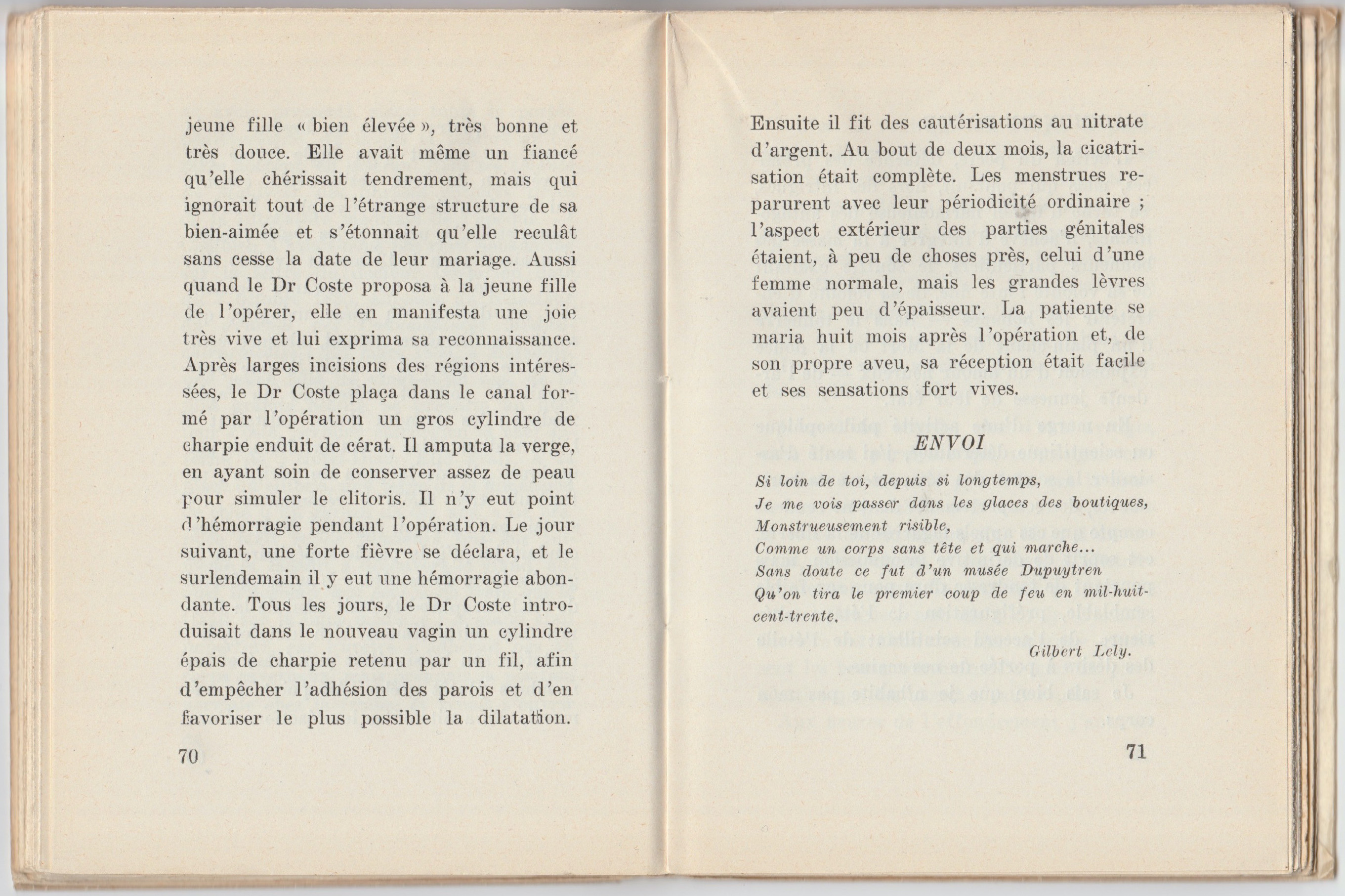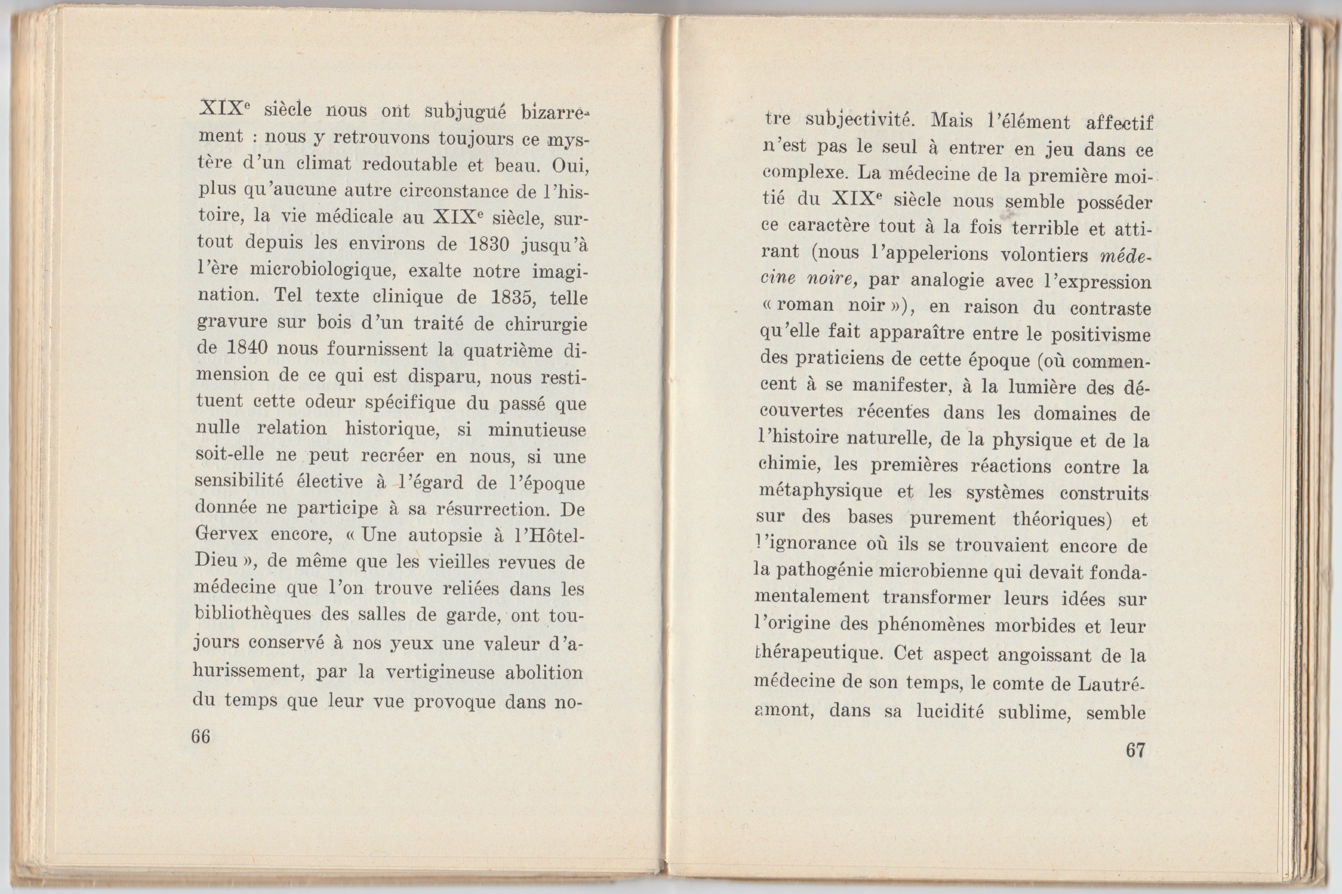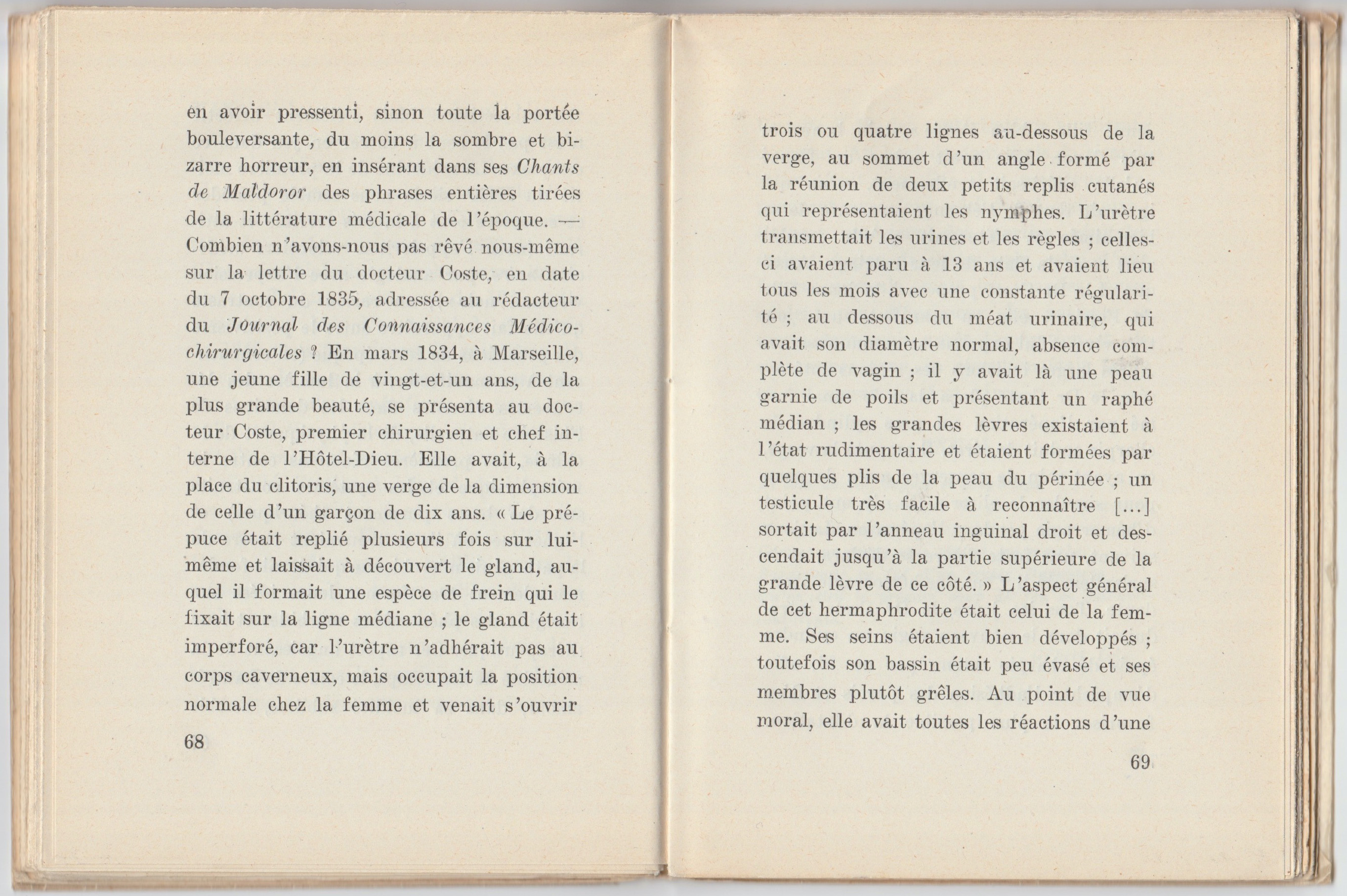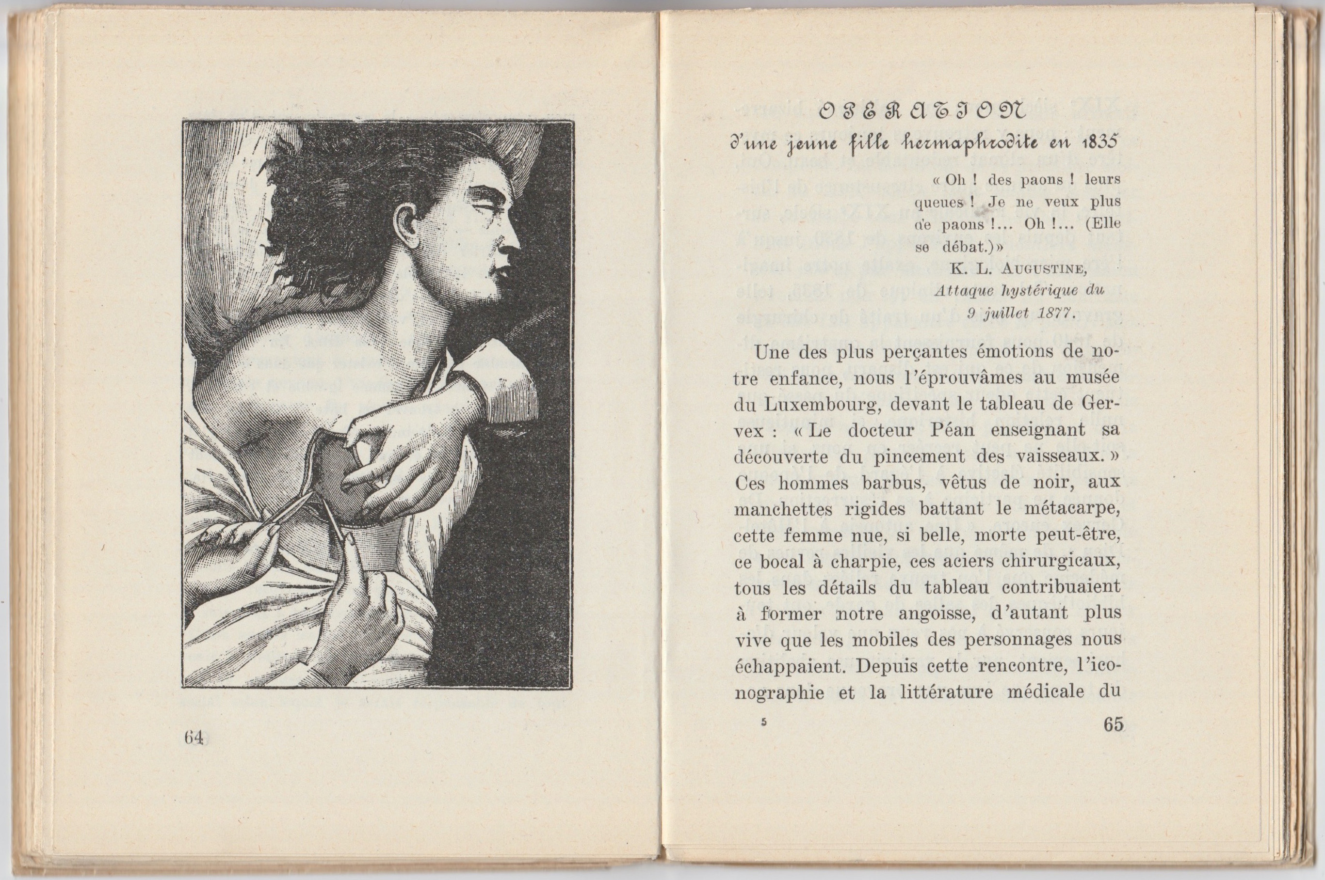 Une des plus perçantes émotions de notre enfance, nous l’éprouvâmes au musée du Luxembourg, devant le tableau de Gervex : « Le docteur Péan enseignant sa découverte du pincement des vaisseaux. » Ces hommes barbus, vêtus de noir, aux manchettes rigides battant le métacarpe, cette femme nue, si belle, morte peut-être, ce bocal à charpie, ces aciers chirurgicaux, tous les détails du tableau contribuaient à former notre angoisse, d’autant plus vive que les mobiles des personnages nous échappaient. Depuis cette rencontre, l’iconographie et la littérature médicale du XIXe siècle nous ont subjugué bizarrement : nous y retrouvons toujours ce mystère d’un climat redoutable et beau. Oui, plus qu’aucune autre circonstance de l’histoire, la vie médicale au XIXe siècle, surtout depuis les environs de 1830 jusqu’à l’ère microbiologique, exalte notre imagination. Tel texte clinique de 1835, telle gravure sur bois d’un traité de chirurgie de 1840 nous fournissent la quatrième dimension de ce qui est disparu, nous restituent cette odeur spécifique du passé que nulle relation historique, si minutieuse soit-elle, ne peut recréer en nous, si une sensibilité élective à l’égard de l’époque donnée ne participe à sa résurrection. De Gervex encore, « Une autopsie à l’Hôtel-Dieu, » de même que les vieilles revues de médecine que l’on trouve reliées dans les bibliothèques des salles de garde, ont toujours conservé à nos yeux une valeur d’ahurissement, par la vertigineuse abolition du temps que leur vue provoque dans notre subjectivité. Mais l’élément affectif n’est pas le seul à entrer en jeu dans ce complexe. La médecine de la première moitié du XIXe siècle nous semble posséder ce caractère tout à la fois terrible et attirant (nous l’appellerions volontiers médecine noire, par analogie avec l’expression « roman noir »), en raison du contraste qu’elle fait apparaître entre le positivisme des praticiens de cette époque (où commencent à se manifester, à la lumière des découvertes récentes dans les domaines de l’histoire naturelle, de la physique et de la chimie, les premières réactions contre la métaphysique et les systèmes construits sur des bases purement théoriques) et l’ignorance où ils se trouvaient encore de la pathogénie microbienne qui devait fondamentalement transformer leurs idées sur l’origine des phénomènes morbides et leur thérapeutique. Cet aspect angoissant de la médecine de son temps, le comte de Lautréamont, dans sa lucidité sublime, semble en avoir pressenti, sinon toute la portée bouleversante, du moins la sombre et bizarre horreur, en insérant dans ses Chants de Maldoror des phrases entières tirées de la littérature médicale de l’époque. – Combien n’avons-nous pas rêvé nous-même sur la lettre du docteur Coste, en date du 7 octobre 1835, adressée au rédacteur du Journal des Connaissances Médico-Chirurgicales ? En mars 1834, à Marseille, une jeune fille de vingt-et-un ans, de la plus grande beauté, se présenta au docteur Coste, premier chirurgien et chef interne de l’Hôtel-Dieu. Elle avait, à la place du clitoris, une verge de la dimension de celle d’un garçon de dix ans. « Le prépuce était replié plusieurs fois sur lui-même et laissait à découvert le gland, auquel il formait une espèce de frein qui le fixait sur la ligne médiane ; le gland était imperforé, car l’urètre n’adhérait pas au corps caverneux, mais occupait la position normale chez la femme et venait s’ouvrir trois ou quatre lignes au-dessous de la verge, au sommet d’un angle formé par la réunion de deux petits replis cutanés qui représentaient les nymphes. L’urètre transmettait les urines et les règles ; celles-ci avaient paru à 13 ans et avaient lieu tous les mois avec une constante régularité ; au-dessous du méat urinaire, qui avait son diamètre normal, absence complète de vagin ; il y avait là une peau garnie de poils et présentant un raphé médian ; les grandes lèvres existaient à l’état rudimentaire et étaient formées par quelques plis de la peau du périnée ; un testicule très facile à reconnaître […] sortait par l’anneau inguinal droit et descendait jusqu’à la partie supérieure de la grande lèvre de ce côté. » L’aspect général de cet hermaphrodite était celui de la femme. Ses seins étaient bien développés ; toutefois, son bassin était peu évasé et ses membres plutôt grêles. Au point de vue moral, elle avait toutes les réactions d’une jeune fille « bien élevée, » très bonne et très douce. Elle avait même un fiancé qu’elle chérissait tendrement, mais qui ignorait tout de l’étrange structure de sa bien-aimée et s’étonnait qu’elle reculât sans cesse la date de leur mariage. Aussi, quand le Dr Coste proposa à la jeune fille de l’opérer, elle en manifesta une joie très vive et lui exprima sa reconnaissance. Après larges incisions des régions intéressées, le Dr Coste plaça dans le canal formé par l’opération un gros cylindre de charpie enduit de cérat. Il amputa la verge, en ayant soin de conserver assez de peau pour simuler le clitoris. Il n’y eut point d’hémorragie pendant l’opération. Le jour suivant, une forte fièvre se déclara, et le surlendemain il y eut une hémorragie abondante. Tous les jours, le Dr Coste introduisait dans le nouveau vagin un cylindre épais de charpie retenu par un fil, afin d’empêcher l’adhésion des parois et d’en favoriser le plus possible la dilatation. Ensuite, il fit des cautérisations au nitrate d’argent. Au bout de deux mois, la cicatrisation était complète. Les menstrues reparurent avec leur périodicité ordinaire ; l’aspect extérieur des parties génitales était, à peu de choses près, celui d’une femme normale, mais les grandes lèvres avaient peu d’épaisseur. La patiente se maria huit mois après l’