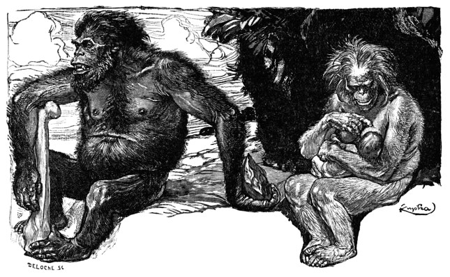 Mais c’étaient des hommes, me direz-vous ! Eh bien, non ! Il suffit de considérer attentivement ces restes, au point de vue morphologique, pour que le doute ne soit plus possible. L’aspect du crâne est bestial ; tous les caractères des simiens s’y trouvent à la fois ; la boîte cérébrale est aplatie, le front fuyant, et, sous des arcades sourcilières énormes, le nez s’en sépare par une dépression profonde comme une entaille de hache ; à tout cela, ajoutez un prognathisme facial, plus hideux encore que celui des descendants de Charles Quint, et dites-moi s’il reste encore un doute sur l’identité simienne de notre précieux sujet ?
