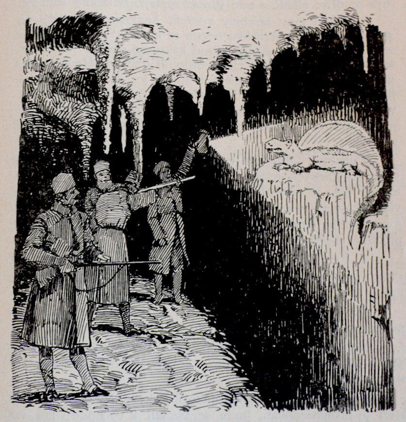 Les feuilles du nid s’écartèrent brutalement ; un bond formidable… et un être extraordinaire, mi-homme, mi-bête, se tenait, là, planté devant l’abbé ahuri. Moment tragique ! car le singe ou l’homme tenait à la main un gourdin terrible.