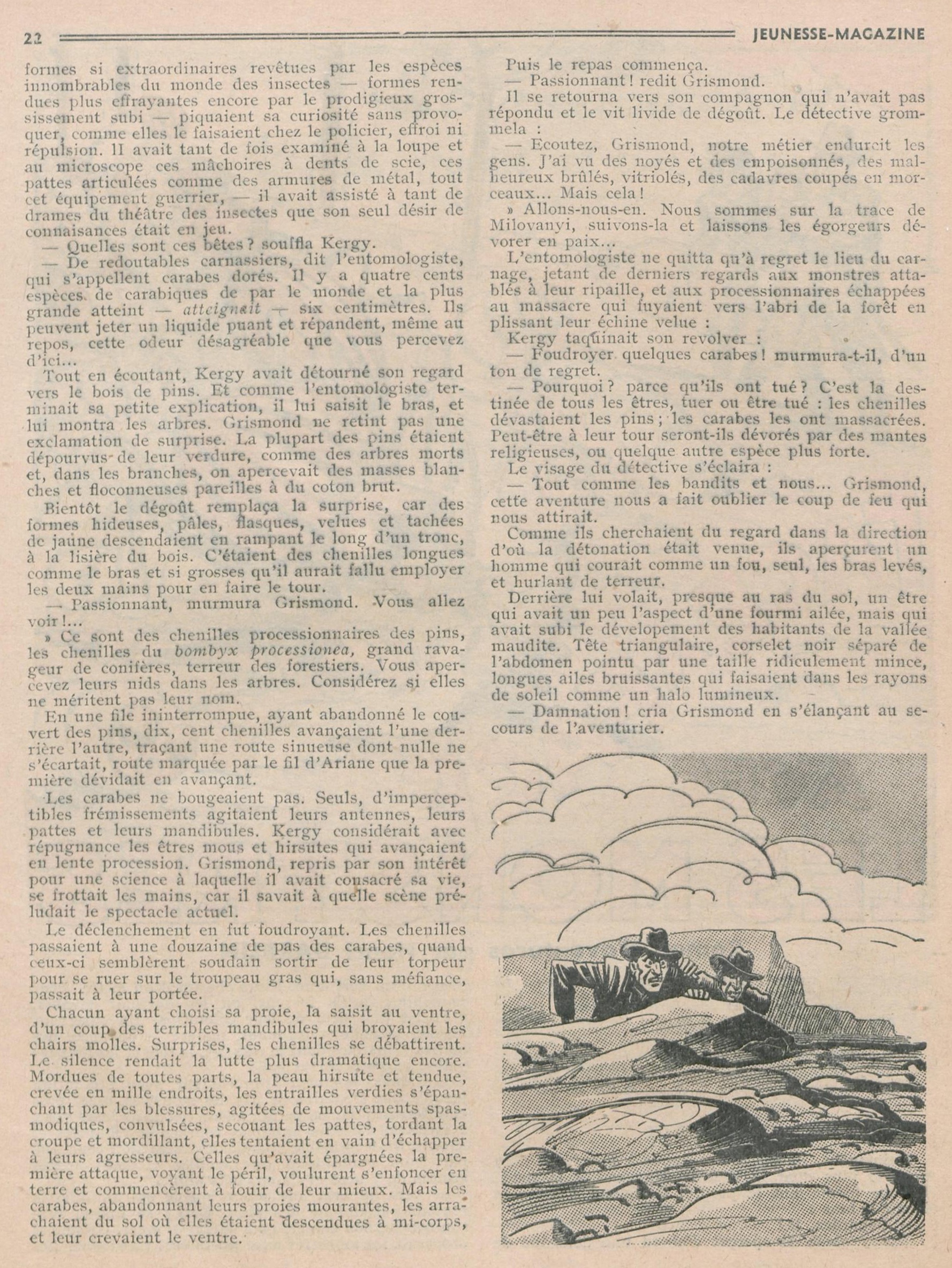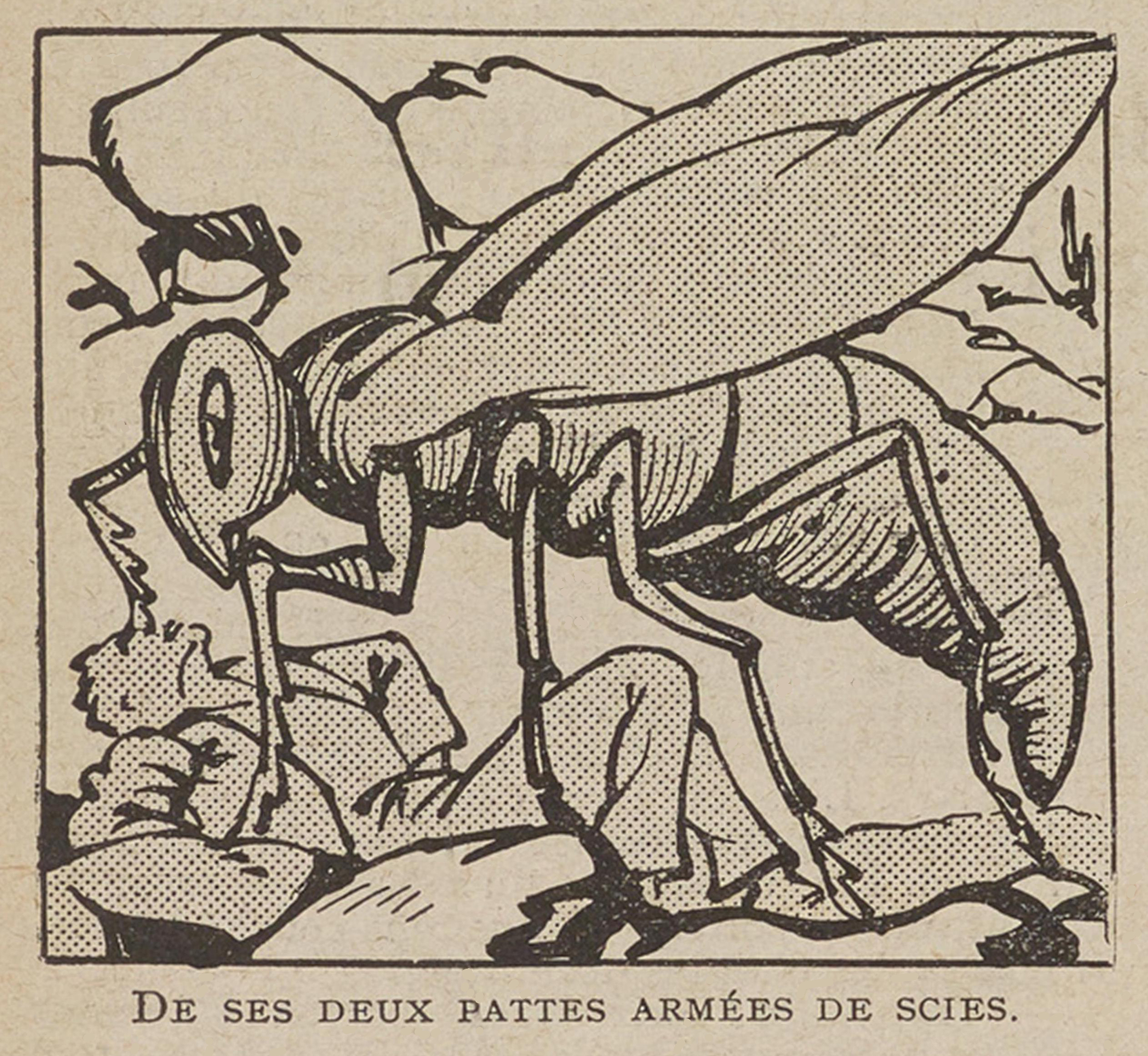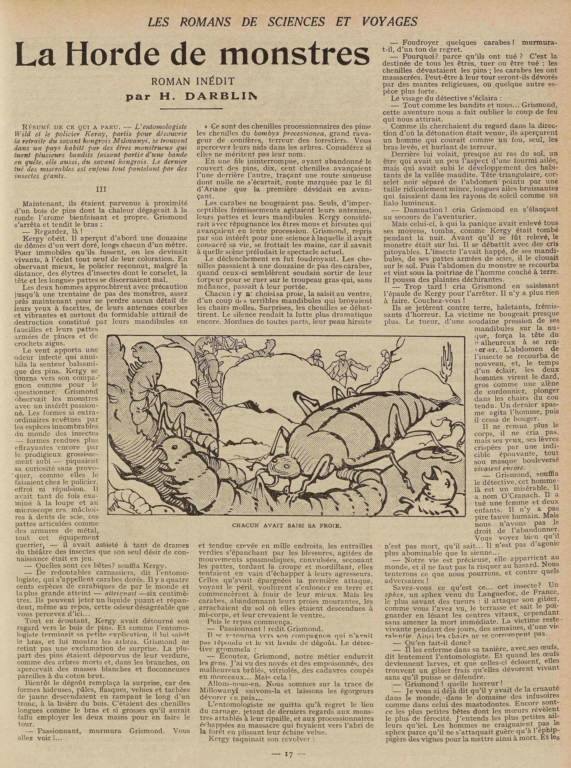 RÉSUMÉ DE CE QUI A PARU. – L’entomologiste Wild et le policier Kergy, à la recherche dans les Montagnes Rocheuses d’un nommé Millovanyi, savant hongrois soupçonné de supercherie scientifique, parcourent un pays de cauchemar dont les habitants, insectes monstrueux, déciment une bande de malfaiteurs également en quête du savant hongrois. Poursuivis, eux aussi, par un de ces êtres chimériques, les savants et le policier se réfugient dans une grotte.