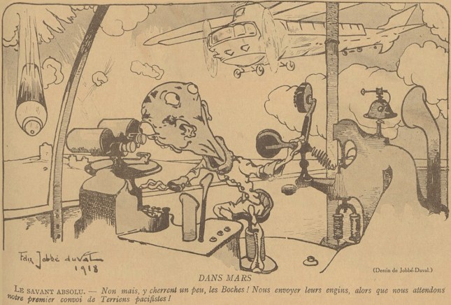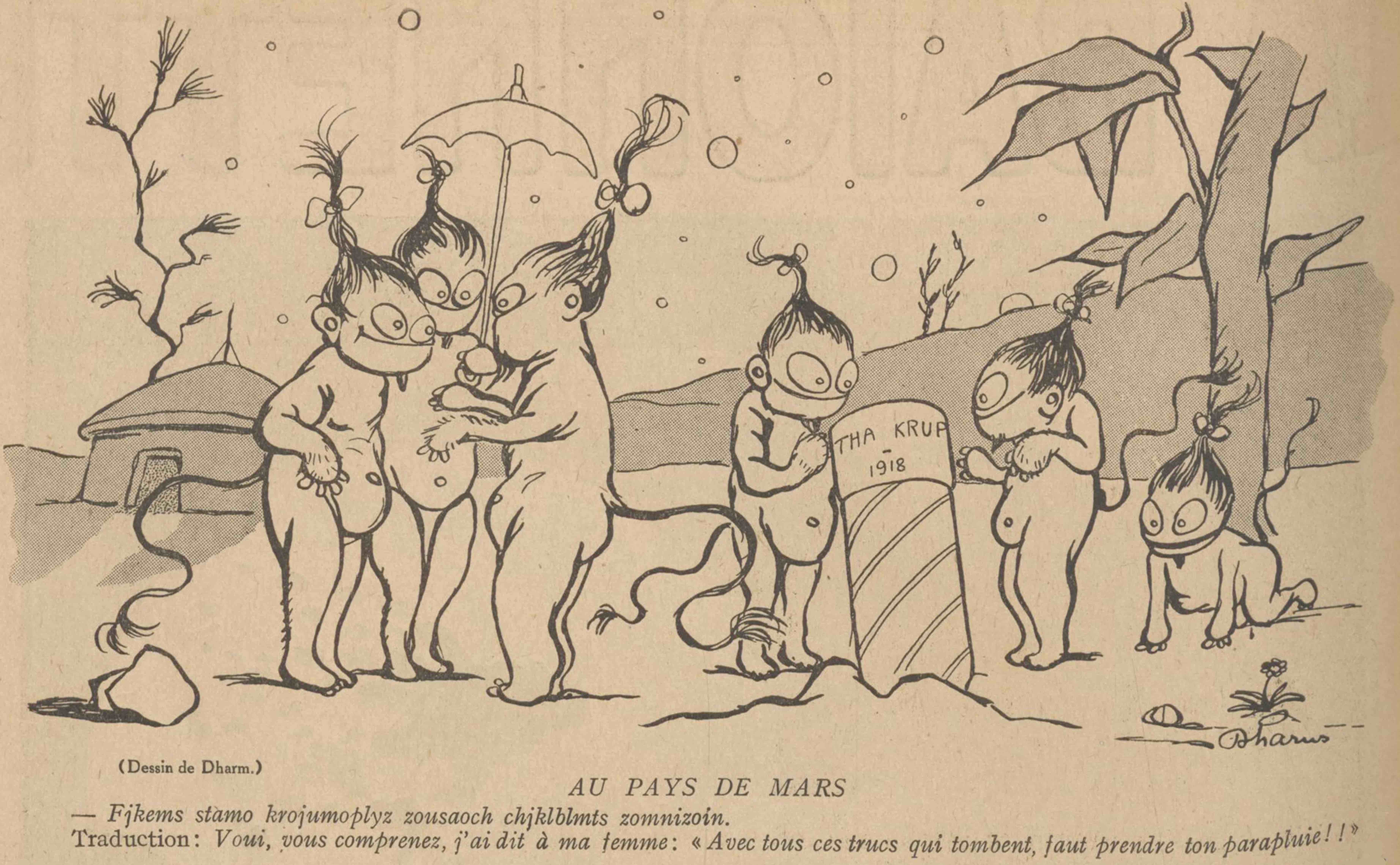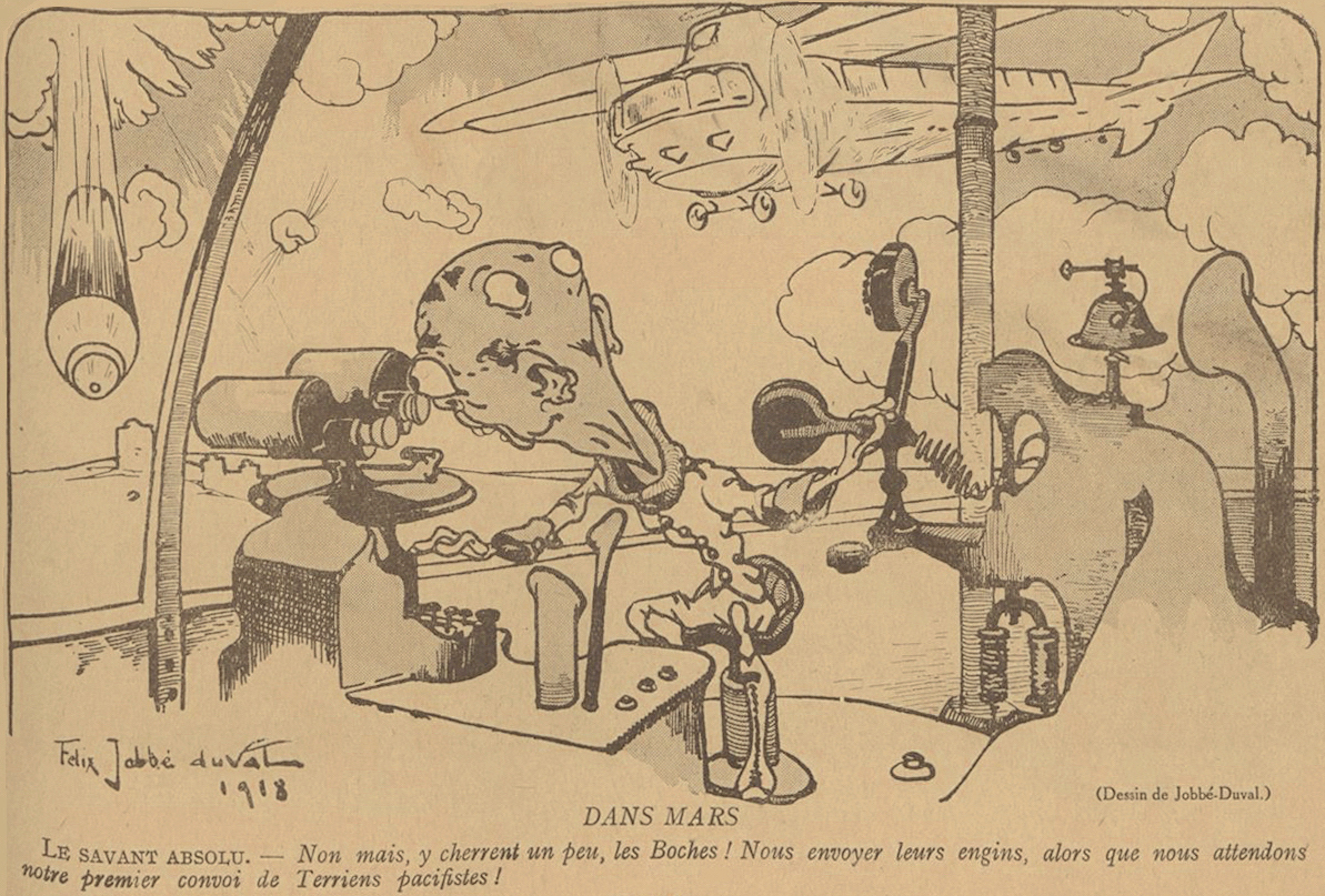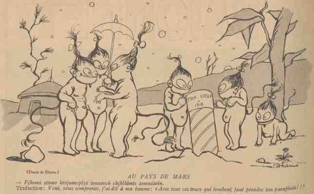 (F. Brillard, in La Grande Revue, quarantième année, n° 4, 1er avril 1936 ; l’illustration d’Auguste Roubille est extraite du numéro de La Baïonnette, consacré à « la Guerre vue des autres Planètes, » quatrième année, n° 175, 7 novembre 1918)