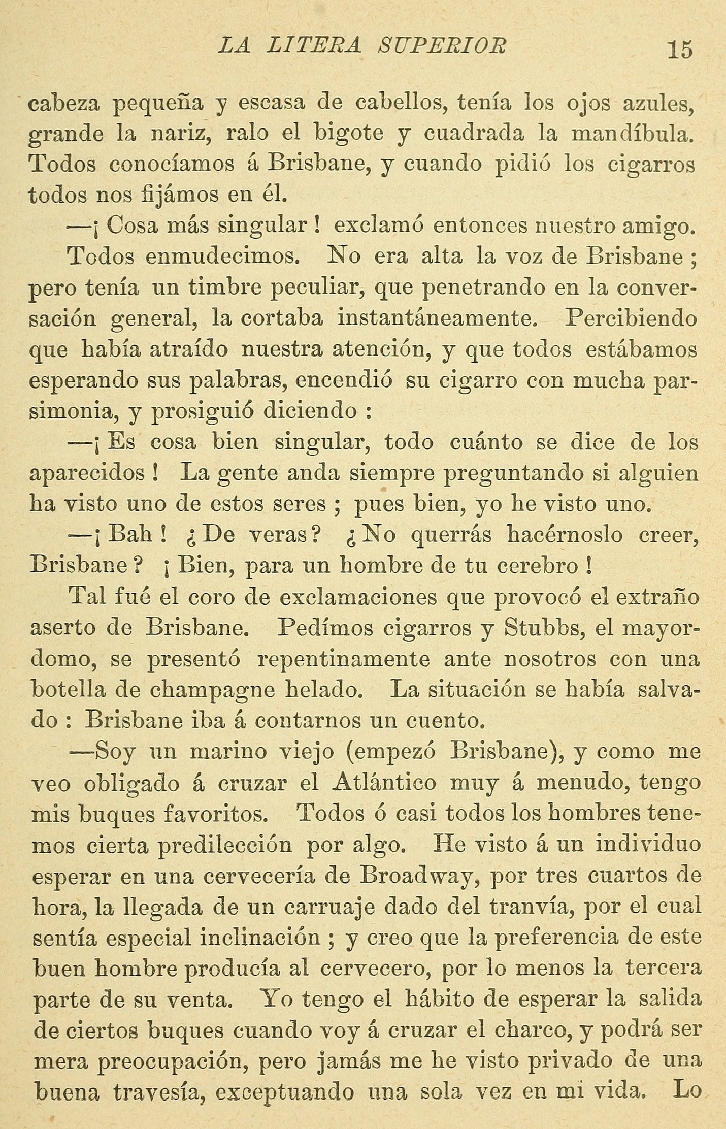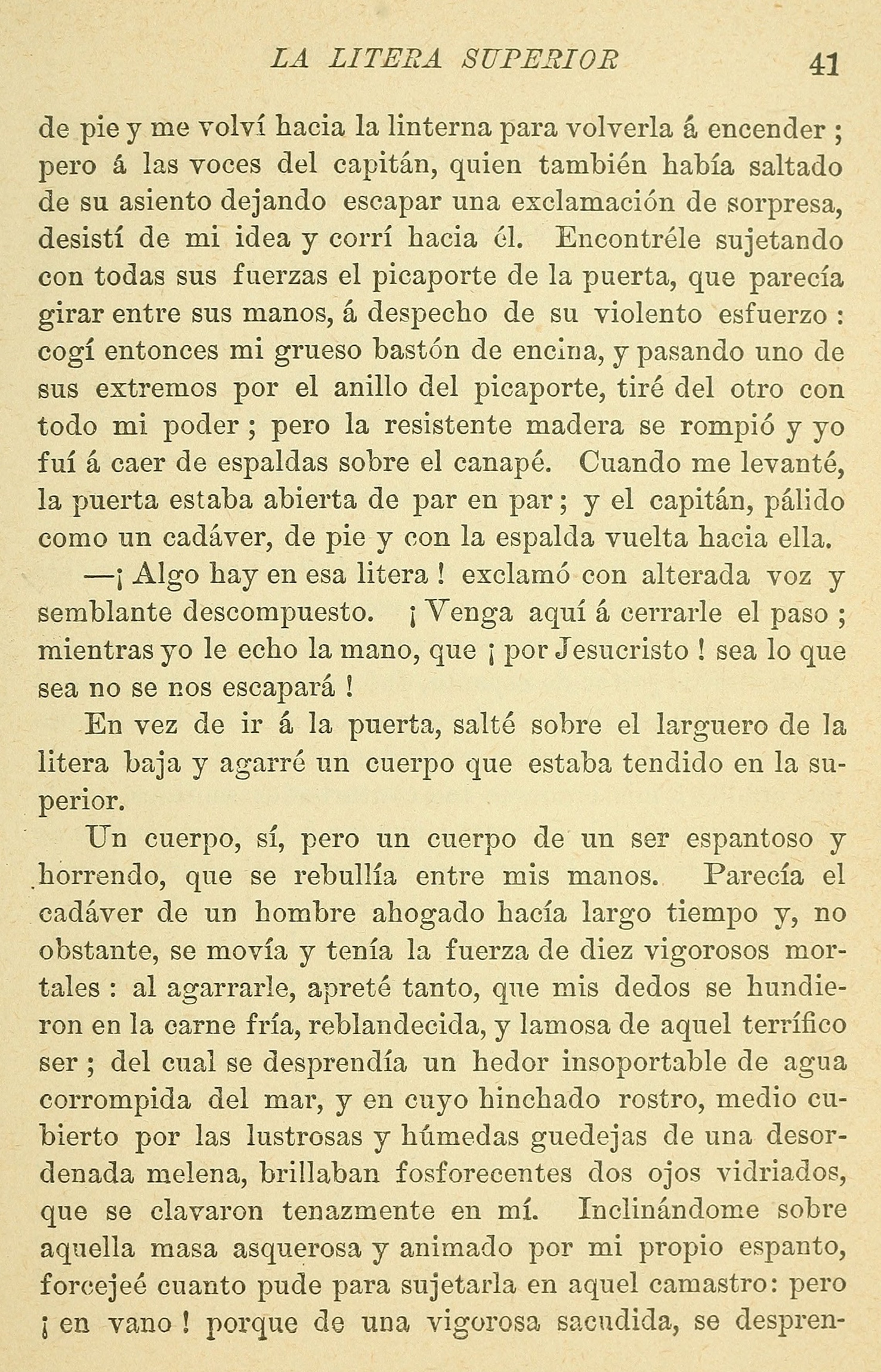 T’imagines-tu cette tête boueuse, aux pattes flasques battant le sol, se traînant et rampant vers toi dans la demi-obscurité de cette salle diabolique, alors que ton système nerveux est déjà détraqué par une suite d’événements qui t’ont préparé et mis au point ?