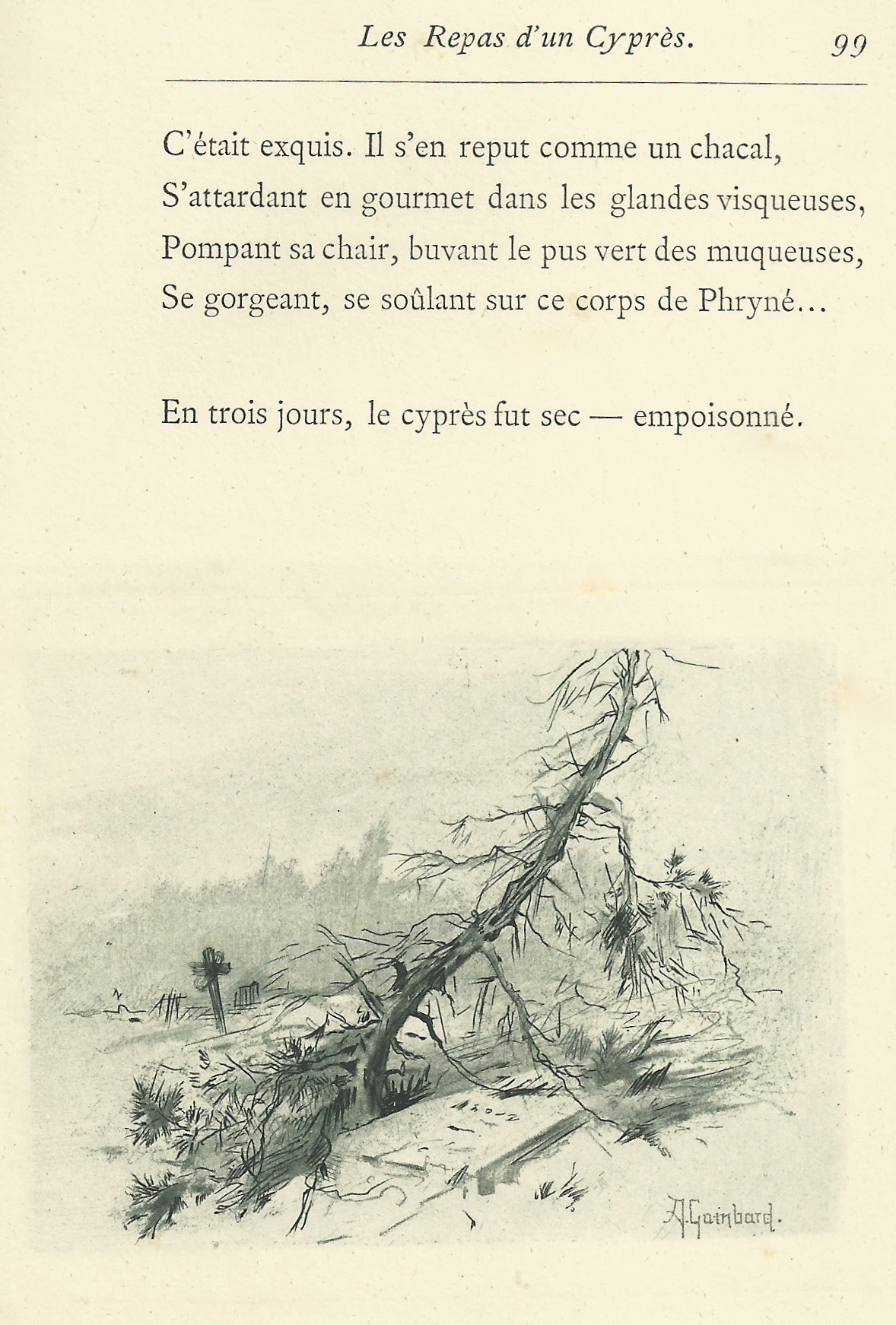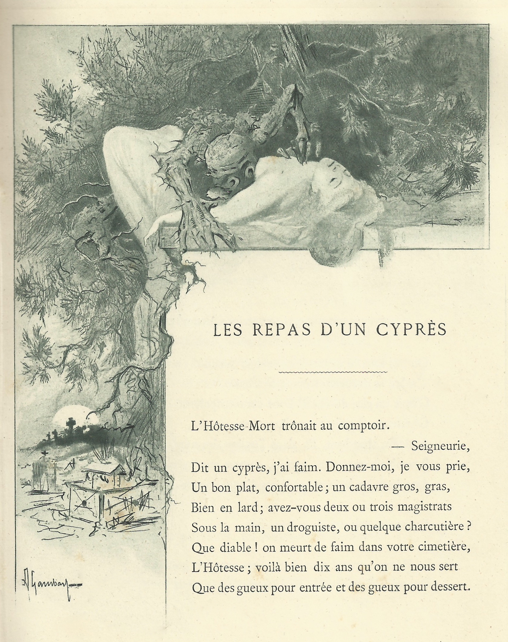« Coco » jeta un regard inquiet sur la table de blanc nappée et demeura médusé. Sur un plat fumant, une tête de veau arrondissait son mufle gélatineux. Horreur ! Dans une de ses paupières molles, son œil, un œil bête et sentimental, le contemplait avec une fixité étrange, aggravée d’une sinistre pointe de moquerie par l’autre paupière lamentablement close. La tête de veau, comme celle du « macchabée » de l’hôpital, lui faisait de l’œil !