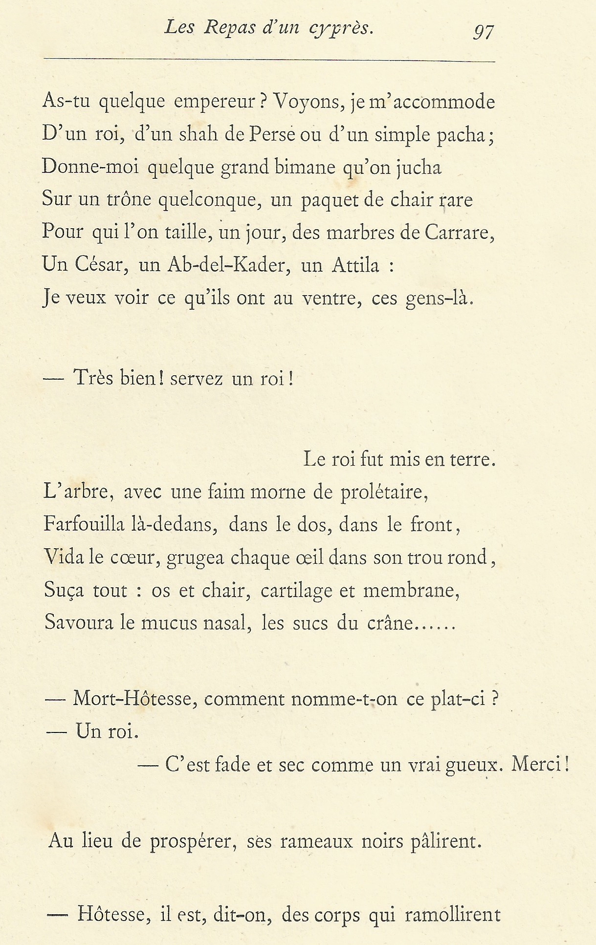 « Enlève-moi cette tête de veau ! Enlève-moi cette tête de veau ! rugit-il, congestionné de colère, et ne m’en sers plus… jamais plus… entends-tu bien ! »