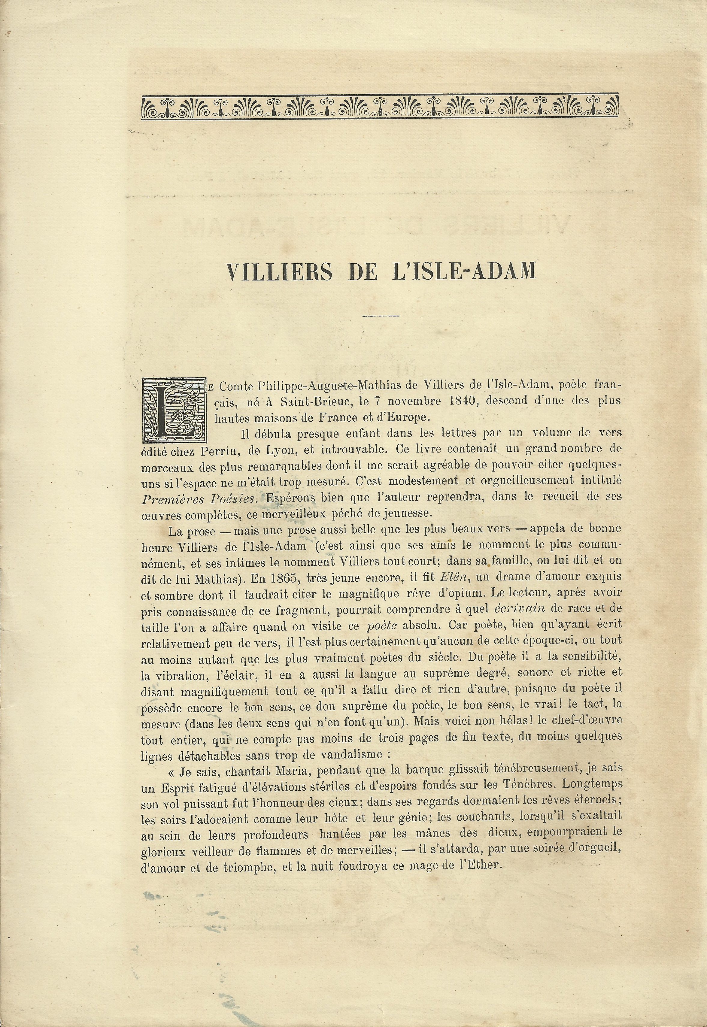 Le 22 ou 23 décembre, je venais de passer la journée au quartier Latin ; il était environ 8 heures du soir, une neige fuligineuse n’avait cessé de tomber et les arbres du Luxembourg en étaient couverts. Je m’apprêtais à monter dans un omnibus afin de regagner Montmartre, où j’avais mon gîte, quand, aux abords de l’Odéon, j’aperçus Verlaine. Que faisait-il là ? Nous étions en hiver, un hiver particulièrement glacé et lugubre. Verlaine était coiffé de son chapeau de feutre habituel, un chapeau déformé et décoloré ; un large manteau du type mac-farlane flottait sur son corps plutôt décharné. Bien qu’il s’aidât de son bâton, il n’avançait qu’avec peine.